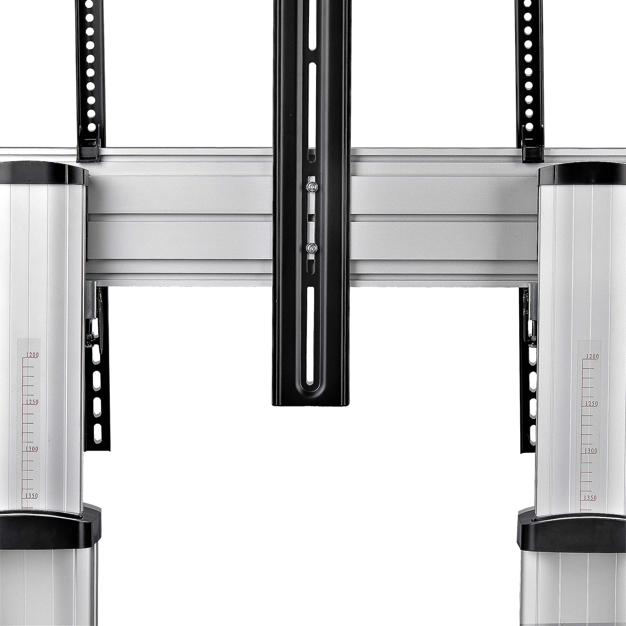 Die Aluminium- und Stahlkonstruktion des robusten TV-Ständers eignet sich ideal für den gewerblichen Einsatz in Umgebungen mit mehreren Benutzern und häufigem Wechsel zwischen verschiedenen Bereichen. Handgriffe an der Rückseite der Säulen in Kombination mit den 10cm Rollen ermöglichen einen reibungslosen Ortswechsel. Sobald der Ständer an seinem Platz steht, können alle Räder blockiert werden. Grundmaße 1138 mm x 700 mm.