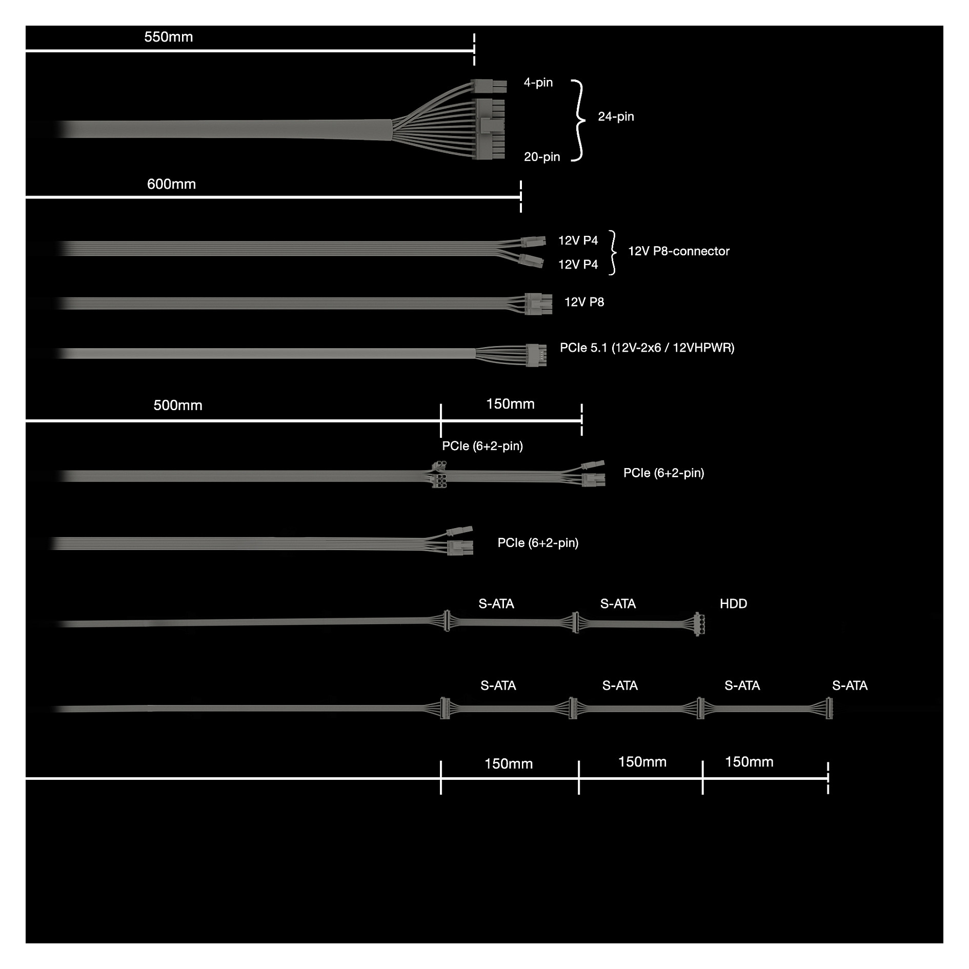 SATA-Netzkabellänge: 500,650,800,950 mm