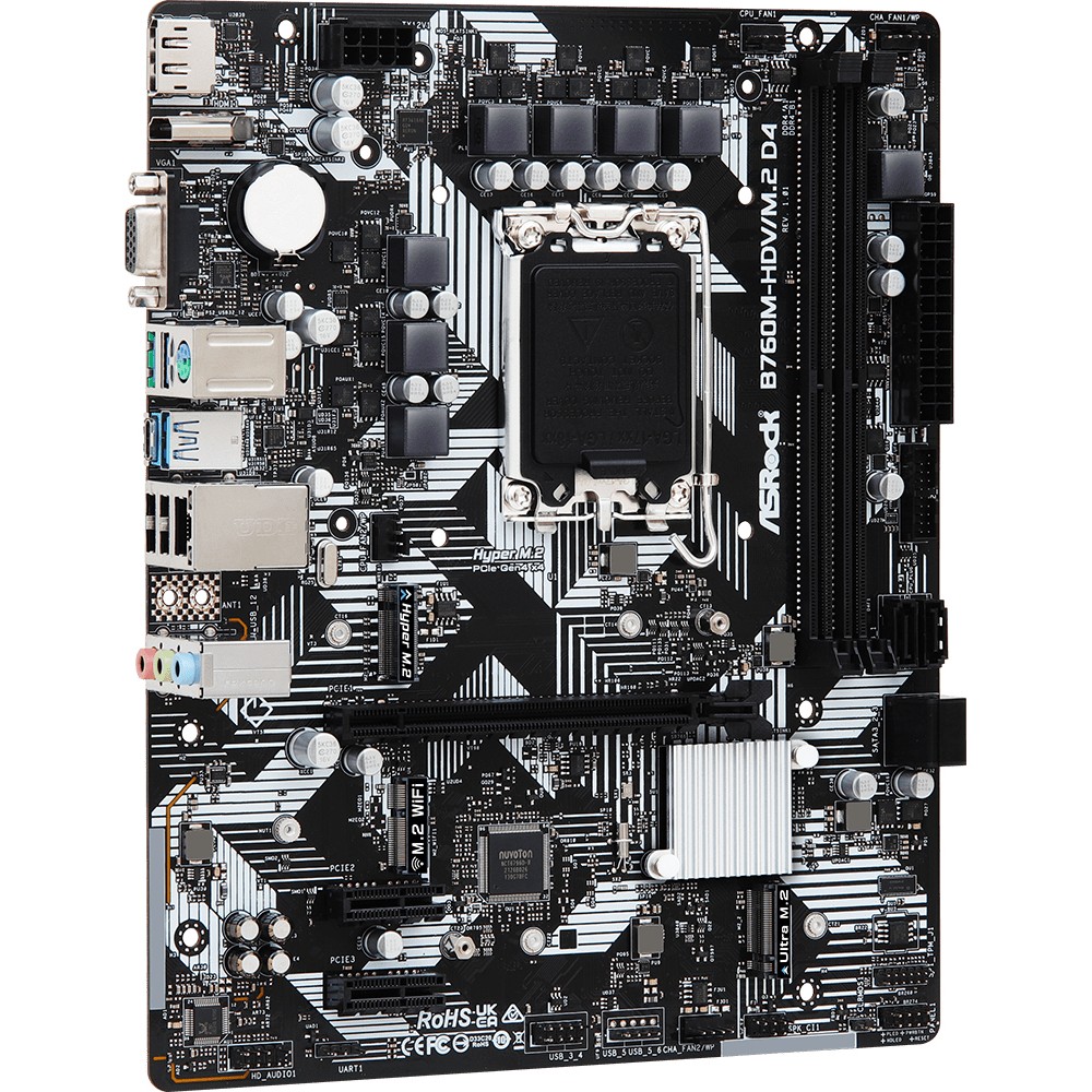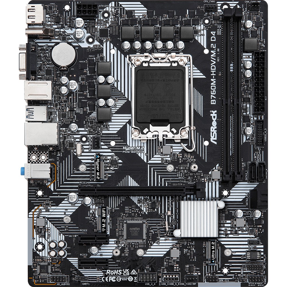 Asrock B760M-HDV/M.2 D4. Prozessorhersteller: Intel, Prozessorsockel: LGA 1700, Kompatible Prozessoren: Intel® Core™ i3, Intel® Core™ i5, Intel® Core™ i7, Intel® Core™ i9. Unterstützte Arbeitsspeicher: DDR4-SDRAM, RAM-Speicher maximal: 64 GB, Arbeitsspeicher Typ: DIMM. Unterstützte Speicherlaufwerk-Schnittstellen: M.2, SATA III, RAID Level: 0, 1, 5, 10. Ethernet Schnittstellen Typ: Gigabit Ethernet, LAN-Controller: Realtek RTL8111H. Komponente für: PC, Motherboardformfaktor: micro ATX, Motherboard Chipsatz Familie: Intel