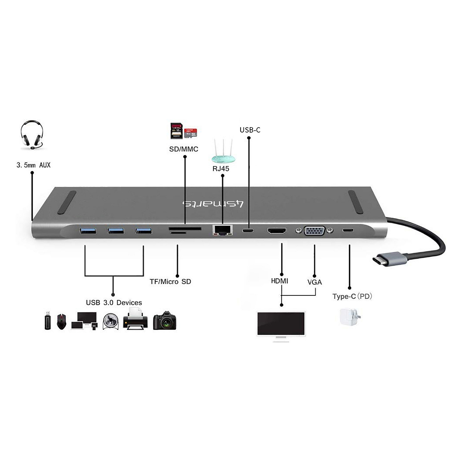 Hub-Schnittstellen: 3.5mm, HDMI, RJ-45, USB 2.0, USB 3.2 Gen 1 (3.1 Gen 1) Type-A, USB Typ-C, VGA