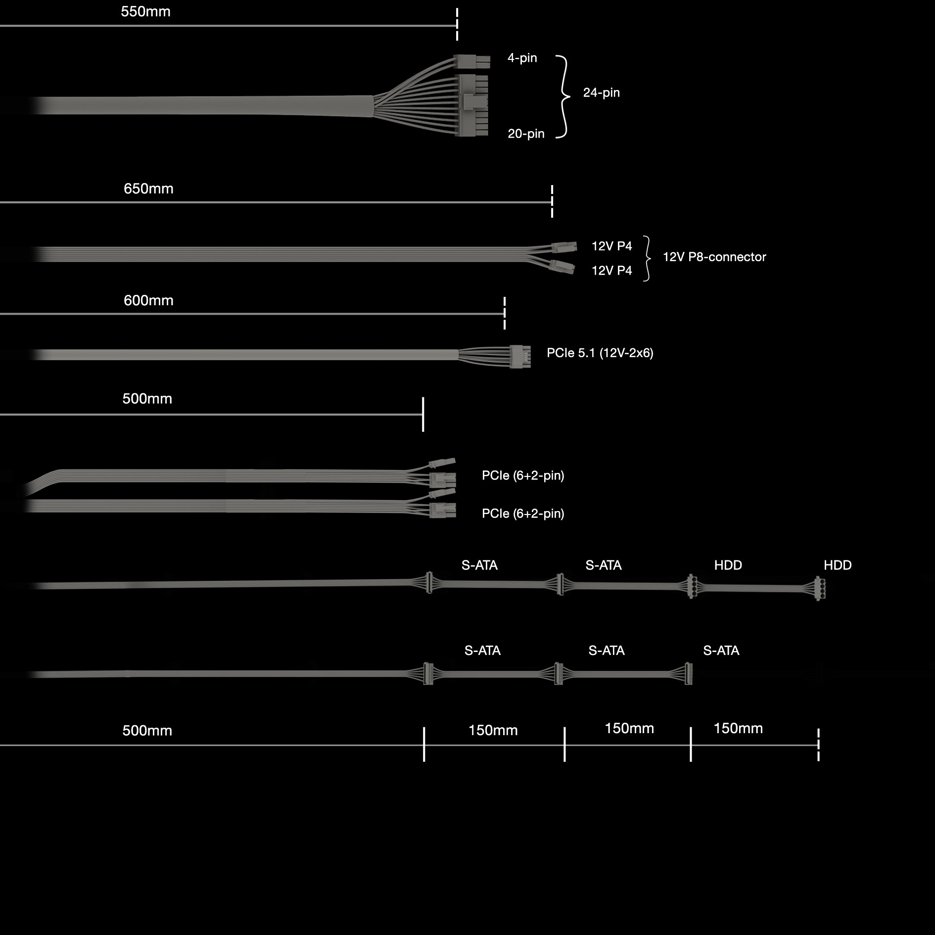 Mitgelieferte Kabel: AC, CPU, PCIe, Peripheral (Molex), SATA