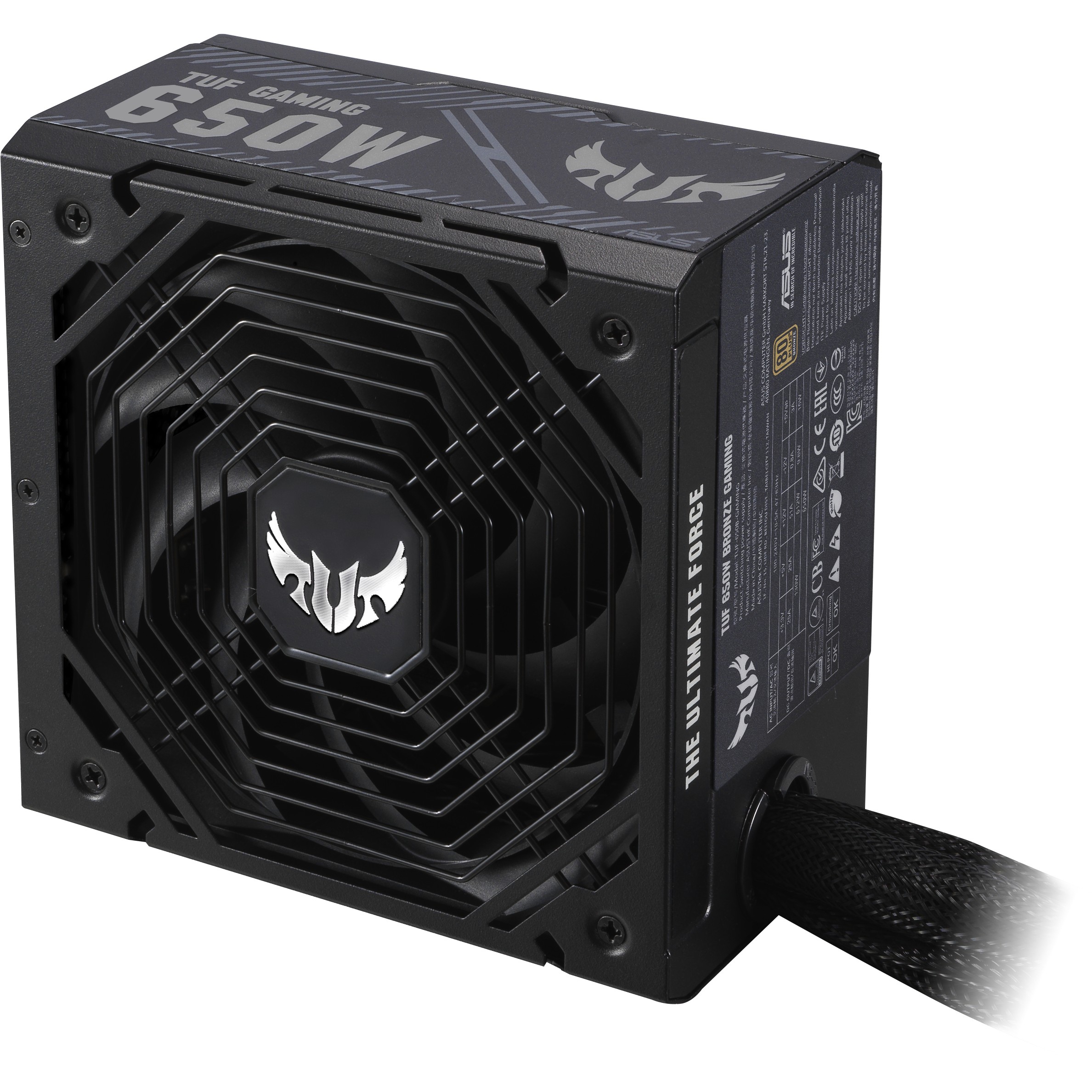 ASUS TUF-GAMING-650B. Gesamtleistung: 650 W, AC Eingangsspannung: 100 - 240 V, Eingangsstrom: 25 A. Motherboard Anschlussstecker: 20+4 pin ATX, Stromkabellänge Motherboard: 60 cm, SATA-Netzkabellänge: 400 mm. Zweck: PC, Stromversorgungseinheit (PSU) Formfaktor: ATX, 80 Plus Zertifizierung: 80 PLUS Bronze. Produktfarbe: Schwarz, Kühlung: Aktiv, Lüfterdurchmesser: 13,5 cm. Mitgelieferte Kabel: CPU, PCIe, Peripheral (Molex), SATA