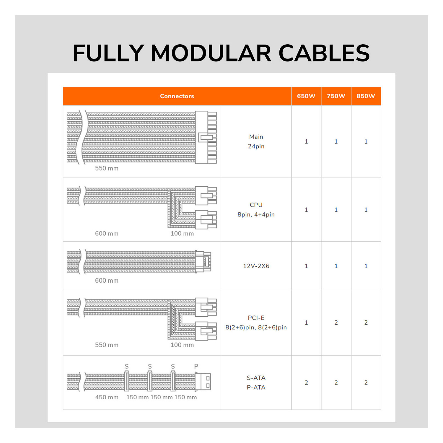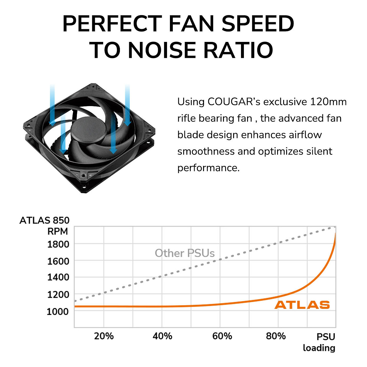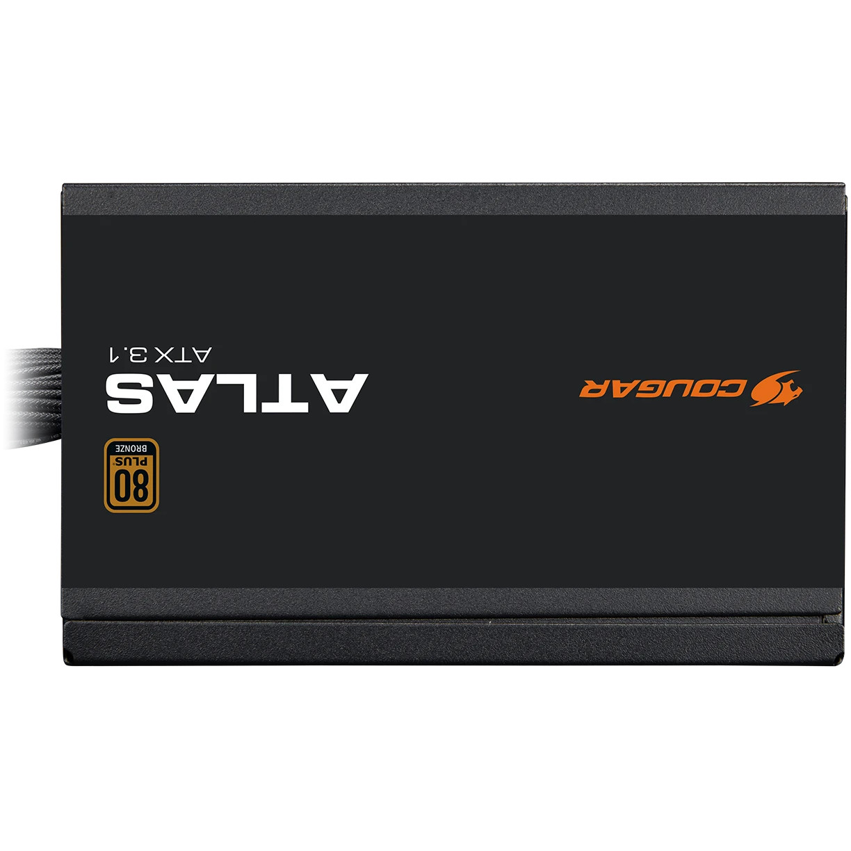COUGAR Netzteil ATLAS 650W ATX3.1 / 80 Plus Bronze. Gesamtleistung: 650 W, AC Eingangsspannung: 100 - 240 V, AC Eingangsfrequenz: 50/60 Hz. Motherboard Anschlussstecker: 24-pin ATX, Stromkabellänge Motherboard: 55 cm, SATA-Netzkabellänge: 150,450 mm. Zweck: PC, Stromversorgungseinheit (PSU) Formfaktor: ATX, 80 Plus Zertifizierung: 80 PLUS Bronze. Produktfarbe: Schwarz, Kühlung: Aktiv, Lüfterdurchmesser: 12 cm. Zertifizierung: CE, FCC, RoHS