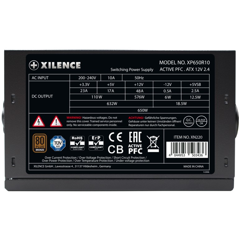 Xilence XN225. Gesamtleistung: 650 W, AC Eingangsspannung: 200 - 240 V, AC Eingangsfrequenz: 50 Hz. Motherboard Anschlussstecker: 20+4 pin ATX, Stromkabellänge Motherboard: 50 cm, Kabeltyp: Nicht-modular. Zweck: PC, Stromversorgungseinheit (PSU) Formfaktor: ATX, 80 Plus Zertifizierung: 80 PLUS Bronze. Produktfarbe: Schwarz, Rot, Kühlung: Aktiv, Lüfterdurchmesser: 14 cm. Konformitätsbescheinigungen: CB, CE, REACH, RoHS, cTUVus, WEEE, Zertifizierung: ErP2014