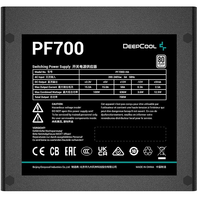 DeepCool PF700. Gesamtleistung: 700 W, AC Eingangsspannung: 220 - 240 V, AC Eingangsfrequenz: 50 Hz. Motherboard Anschlussstecker: 20+4 pin ATX, Stromkabellänge Motherboard: 55 cm, SATA-Netzkabellänge: 450,600,750,900 mm. Zweck: PC / Server, Stromversorgungseinheit (PSU) Formfaktor: ATX, 80 Plus Zertifizierung: 80 PLUS. Produktfarbe: Schwarz, Kühlung: Aktiv, Lüfterdurchmesser: 12 cm. Mitgelieferte Kabel: AC