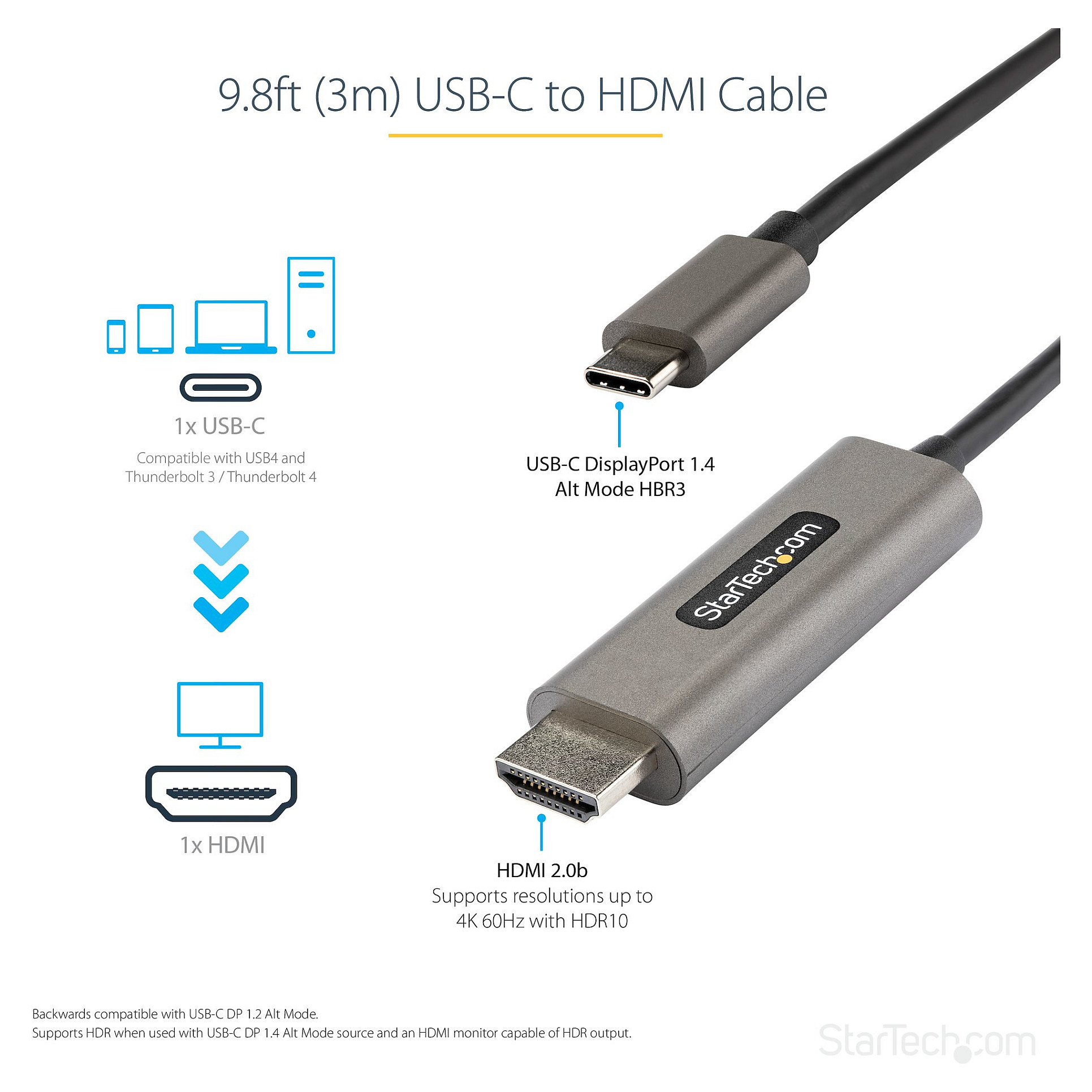 Mit diesem USB-C auf HDMI-Kabel können Sie Ihren USB Typ-C Laptop (mit DP-Alt-Modus-Unterstützung) oder Ihr Thunderbold 3 an ein HDMI-Display anschließen. Das Displaykabel unterstützt High Dynamic Range (HDR) und sorgt für schärfere Bilder mit verbesserter Videoqualität.