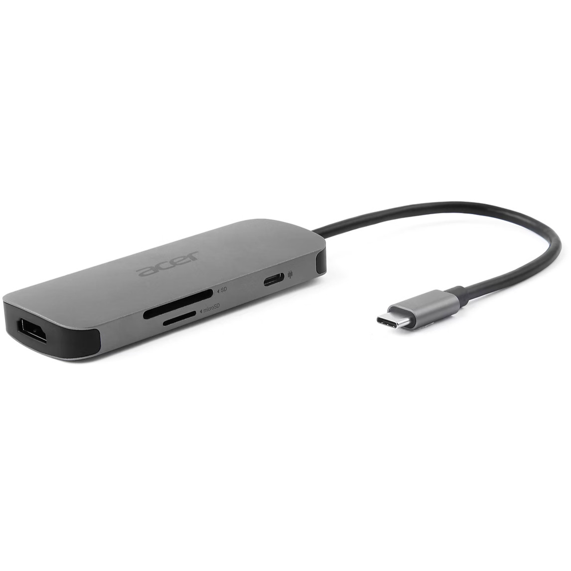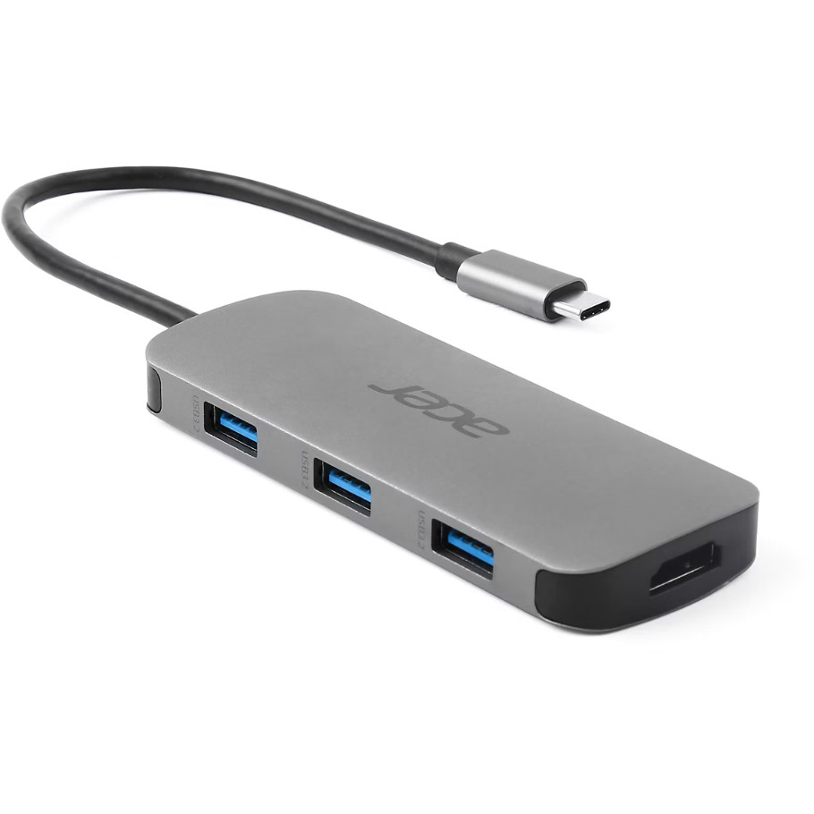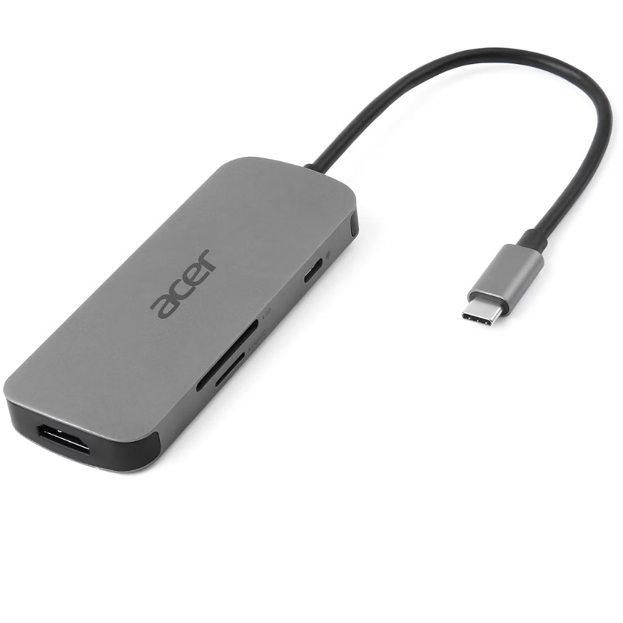 Acer 7in1 Type C Dongle. Übertragungstechnik: Kabelgebunden, Hostschnittstelle: USB 3.2 Gen 1 (3.1 Gen 1) Type-C, USB-Stromversorgung bis zu: 100 W. Produktfarbe: Silber, Kompatible Speicherkarten: MicroSD (TransFlash), SD, Auflösung (maximal, digital): 3840 x 2160 Pixel. Unterstützung anderer Betriebsysteme: ChromeOS. Breite: 40 mm, Tiefe: 101,6 mm, Höhe: 12,5 mm