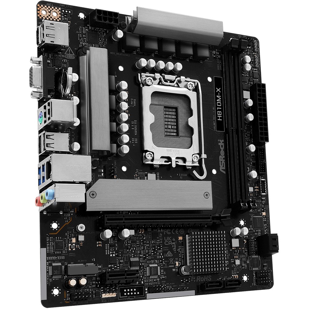 Asrock H810M-X. Prozessorhersteller: Intel, Prozessorsockel: LGA 1851 (Socket V1), Kompatible Prozessoren: Intel Core Ultra (Series 2). Unterstützte Arbeitsspeicher: DDR5-SDRAM, RAM-Speicher maximal: 128 GB, Arbeitsspeicher Typ: DIMM. Unterstützte Speicherlaufwerk-Schnittstellen: M.2, SATA III, Unterstützte Speicherlaufwerke: HDD & SSD. Ethernet Schnittstellen Typ: 2.5 Gigabit Ethernet, LAN-Controller: Dragon RTL8125BG. Komponente für: PC, Motherboardformfaktor: micro ATX, Motherboard Chipsatz Familie: Intel