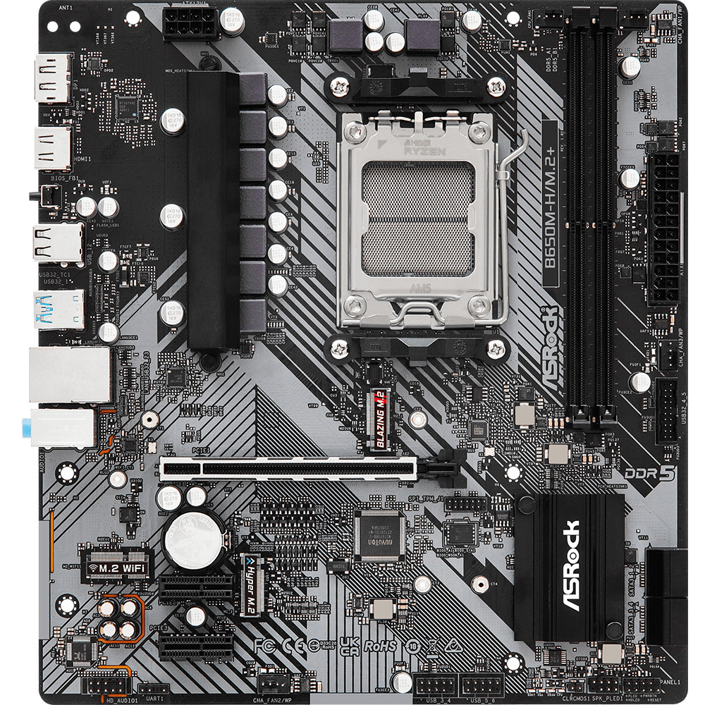 Asrock B650M-H/M.2+. Prozessorhersteller: AMD, Prozessorsockel: Sockel AM5. Unterstützte Arbeitsspeicher: DDR5-SDRAM, RAM-Speicher maximal: 96 GB, Arbeitsspeicher Typ: DIMM. Unterstützte Speicherlaufwerk-Schnittstellen: M.2, SATA III, RAID Level: 0, 1, 10. Grafikkarte-Familie: AMD. Ethernet Schnittstellen Typ: Gigabit Ethernet, LAN-Controller: Realtek RTL8111H