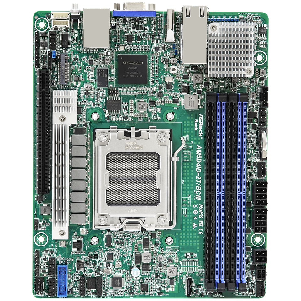 Asrock AM5D4ID-2T/BCM. Prozessorhersteller: AMD, Prozessorsockel: Sockel AM5, Kompatible Prozessoren: AMD EPYC 4004, AMD Ryzen 7000 Series, AMD Ryzen 8000 Series, AMD Ryzen 9000 Series. Unterstützte Arbeitsspeicher: DDR5-SDRAM, Arbeitsspeicher Typ: DIMM, Speicherspannung: 1.1 V. Unterstützte Speicherlaufwerk-Schnittstellen: M.2, Unterstützte Speicherlaufwerke: SSD. Grafikkarte-Familie: ASPEED, Grafikkarte: AST2600. Ethernet Schnittstellen Typ: 10 Gigabit Ethernet, LAN-Controller: Broadcom BCM57416