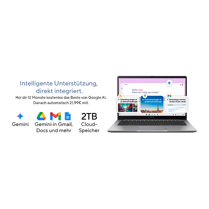 Dank der cloudbasierten Architektur und der engen Verzahnung mit ChromeOS erhältst Du sofortigen Zugriff auf intelligente Funktionen – direkt im Browser, in Dokumenten oder beim Surfen. Gemini unterstützt bei der Texterstellung, hilft beim Verfassen von E-Mails, fasst Inhalte zusammen und beantwortet Fragen kontextbezogen – alles ohne zusätzliche Softwareinstallation. Für Schüler, Studierende und Berufstätige bedeutet das: produktiver arbeiten, schneller lernen und kreativer kommunizieren – mit einem Laptop, das leicht, sicher und immer aktuell ist.