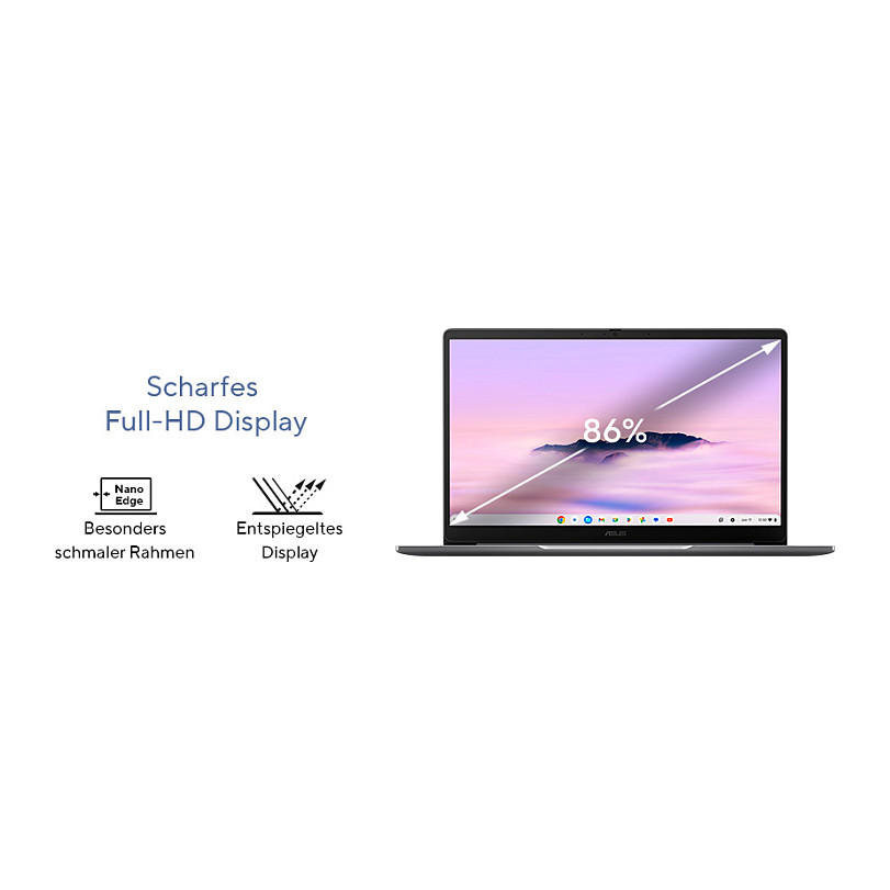 Das Chromebook Plus CX14 bietet ein beeindruckendes Full-HD Display mit schmalen Rahmen und einem Screen-to-Body-Verhältnis von 86%. Dies sorgt für ein intensives Seherlebnis, egal ob Du arbeitest, lernst oder Dich unterhalten lässt. Genieße gestochen scharfe Bilder und lebendige Farben auf diesem brillanten Display.