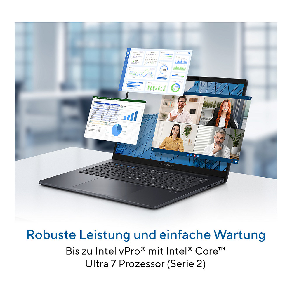 Angetrieben von einem bis zu Intel Core Ultra 7-Prozessor (Serie 2) mit Intel vPro und Intel Arc-Grafik, bietet das ASUS ExpertBook B3 starke Leistung, um anspruchsvolle Aufgaben zu erfüllen. Es steigert das Geschäftspotenzial mit smarter, schneller Performance, die für die Herausforderungen von heute unerlässlich ist – für nahtloses Multitasking, fortschrittliche Datenverarbeitung und effiziente Abläufe. Kurz gesagt, das ExpertBook B3 ermöglicht moderne Arbeitsweisen, hebt Geschäftsaktivitäten auf ein neues Niveau und befähigt Mitarbeiter, smarte Ergebnisse zu erzielen.