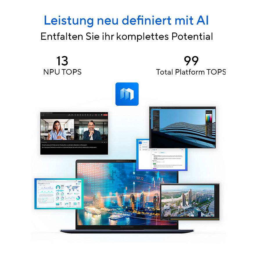 Das ASUS ExpertBook B5 ist ein leistungsstarker Business-Laptop mit AI-Technologie, der ultimative Leistung, Sicherheit und Produktivität bietet. Eine dedizierte NPU mit 13 TOPS (Tera Operations per Second) liefert bis zu 99 Total Plattform-TOPS für reaktionsschnelles Multitasking.