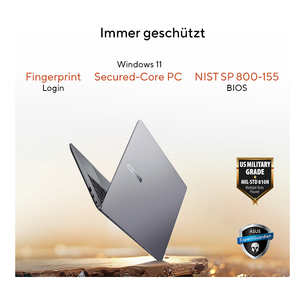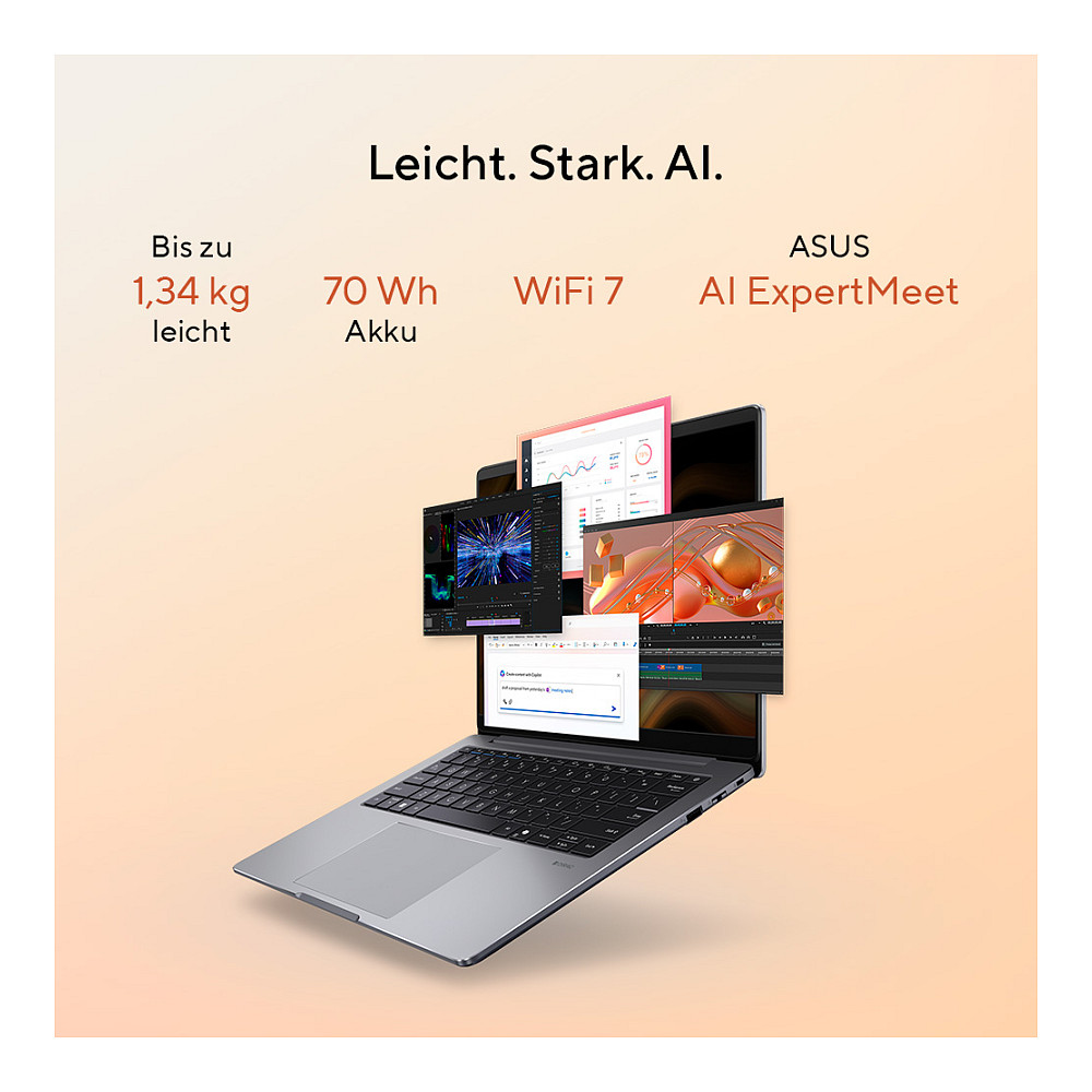 Das ASUS ExpertBook PM3 bietet die perfekte Mischung aus smarter AI-Leistung, Sicherheit und Mobilität. Angetrieben von einem bis zu AMD Ryzen™ AI 7-Prozessor und einer AI-Perfomance von insgesamt bis zu 50 TOPS bewältigt es alle Workloads und Anwendungen mit Bravour. Das neue ExpertBook wurde für Berufstätige entwickelt, die viel unterwegs sind. Der leistungsstarke 70-Wh-Akku bietet eine beeindruckende Akkulaufzeit von 18,5 Stunden, sodass Sie auch unterwegs produktiv arbeiten können. Für die Sicherheit verfügt das ASUS ExpertBook PM3 über ASUS ExpertGuardian, einschließlich NIST SP 800-155-konformen BIOS, integriertem Fingerabdrucksensor und einem TPM 2.0-Chips – so bleiben Ihre sensiblen Daten von der Hardware bis zur Software geschützt.