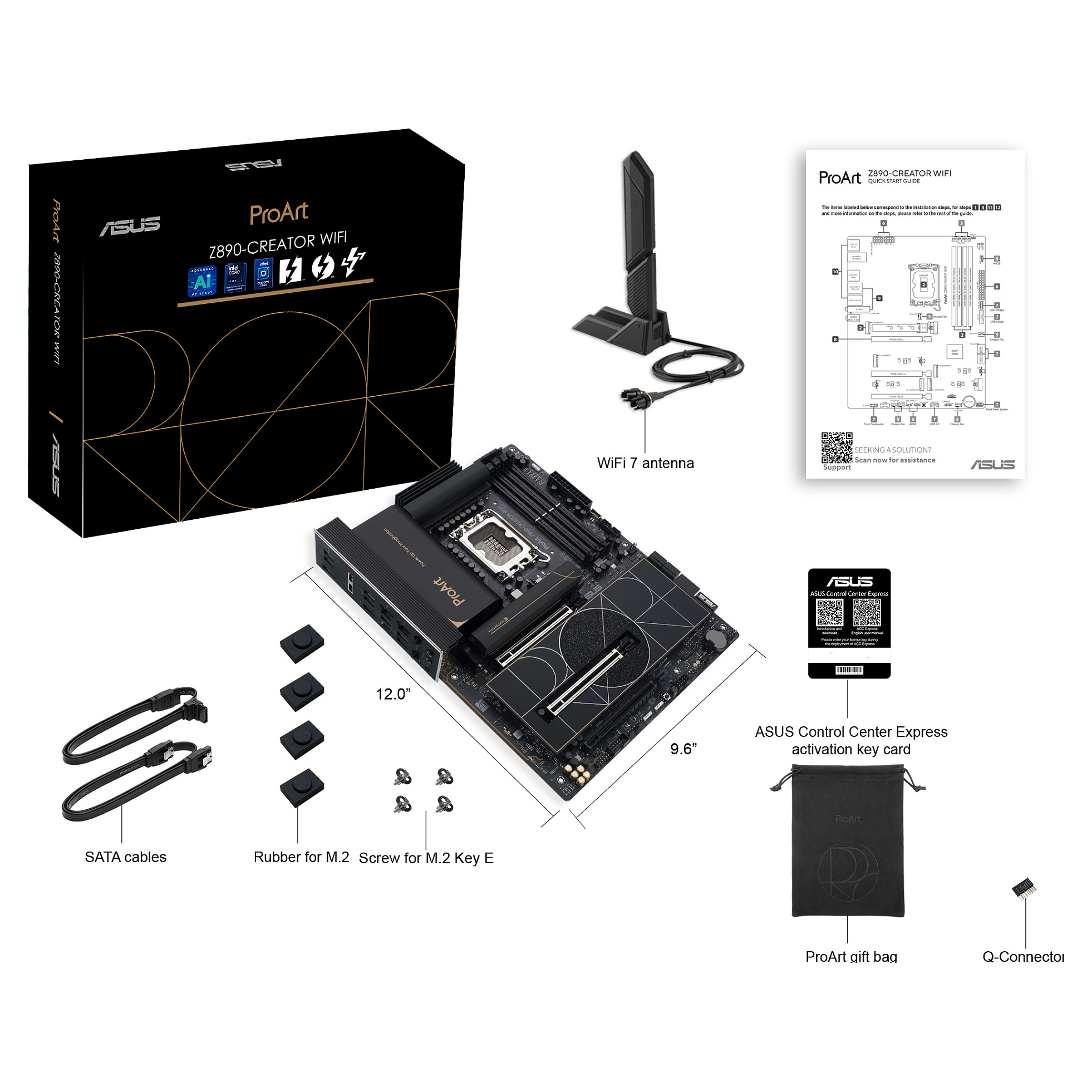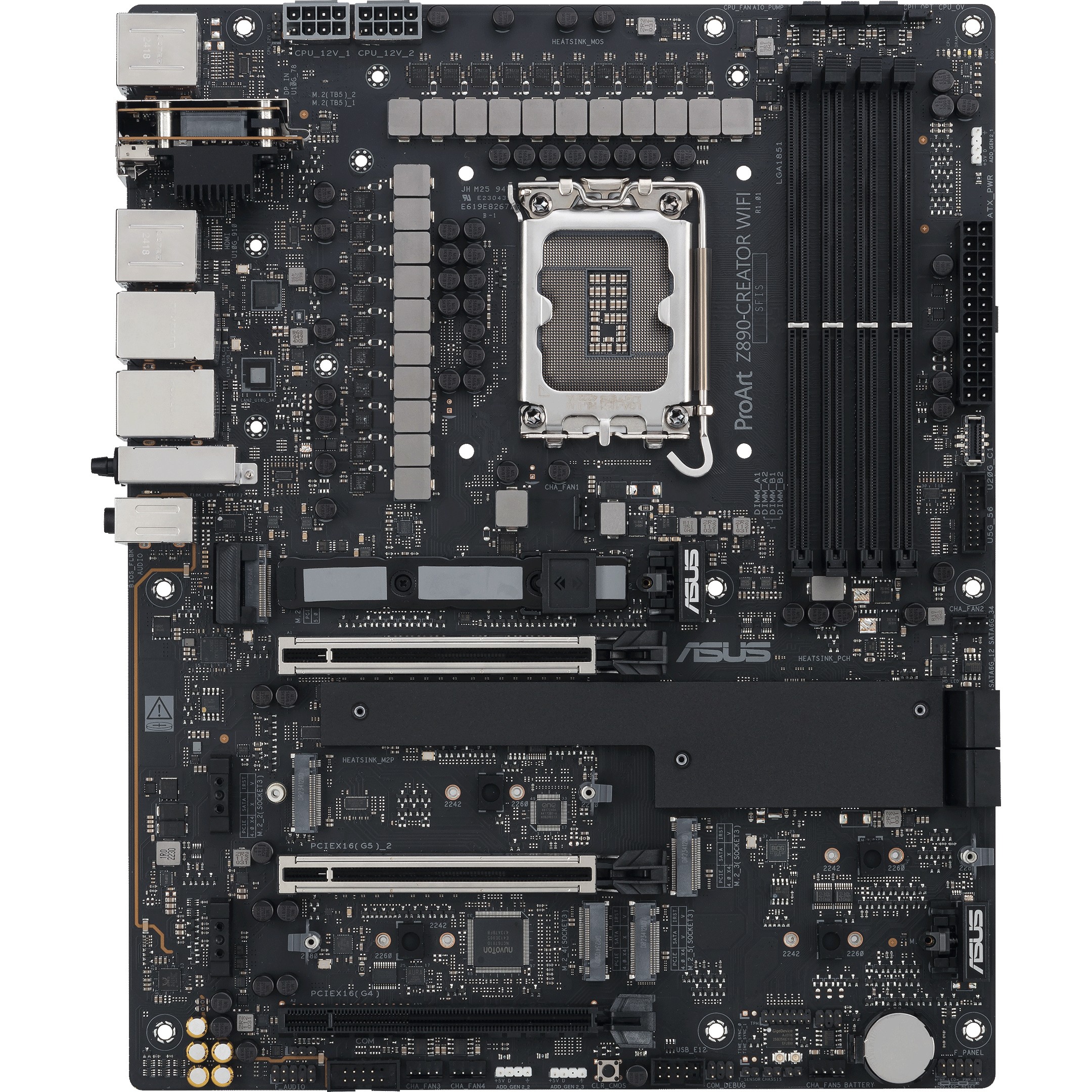ASUS PROART Z890-CREATOR WIFI. Prozessorhersteller: Intel, Prozessorsockel: LGA 1851 (Socket V1), Kompatible Prozessoren: Intel Core Ultra (Series 2). Unterstützte Arbeitsspeicher: DDR5-SDRAM, RAM-Speicher maximal: 192 GB, Arbeitsspeicher Typ: DIMM. Unterstützte Speicherlaufwerk-Schnittstellen: M.2, SATA III, Unterstützte Speicherlaufwerke: HDD & SSD, RAID Level: 0, 1, 5, 10. Maximale Auflösung: 7680 x 4320 Pixel. Ethernet Schnittstellen Typ: 2.5 Gigabit Ethernet, 10 Gigabit Ethernet, Top WLAN-Standard: Wi-Fi 7 (802.11be), WLAN-Standards: Wi-Fi 7 (802.11be)