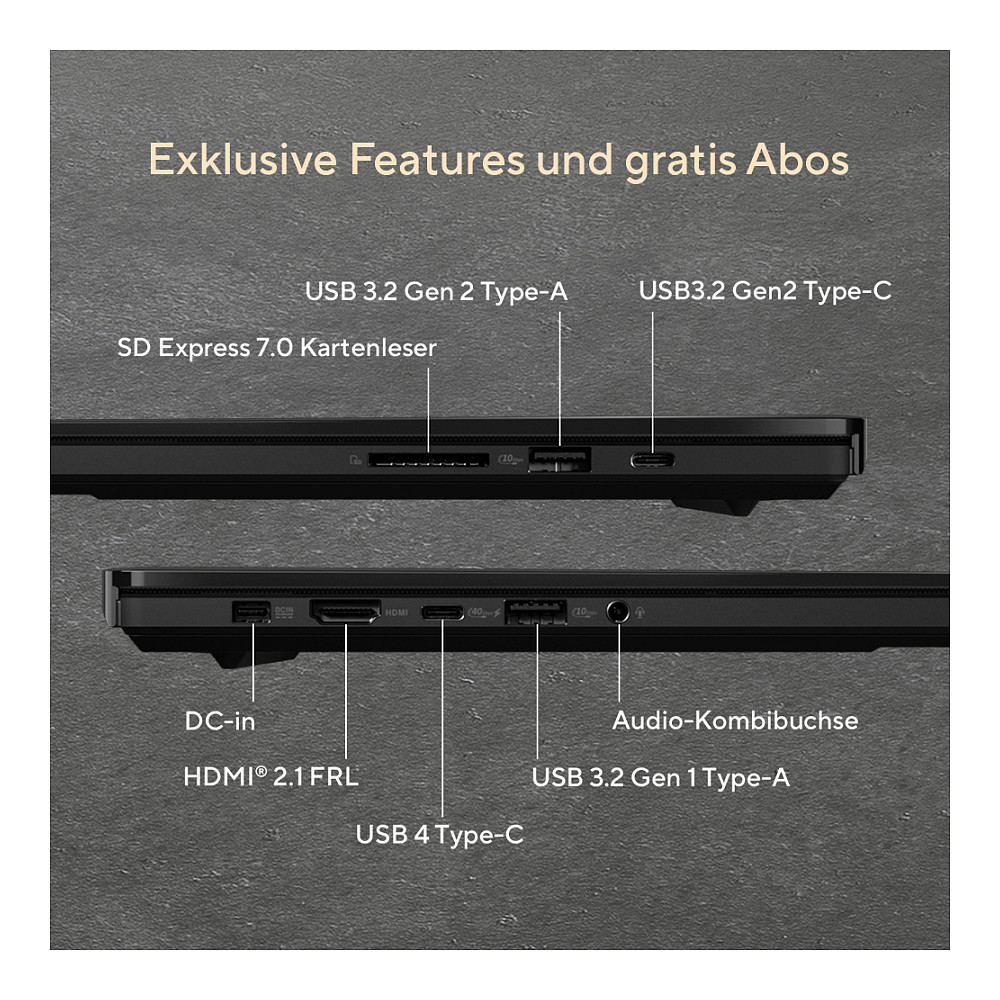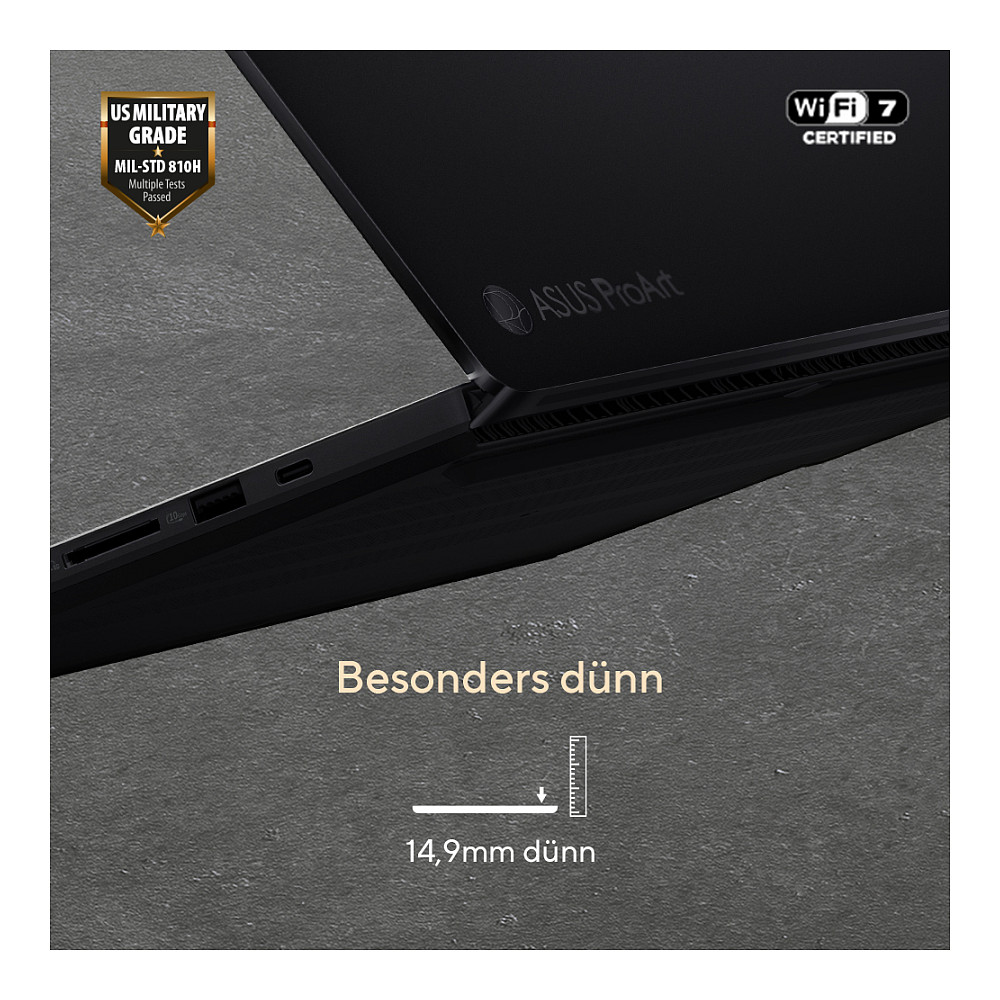 Umfassende I/O Anschlüsse ermöglichen nahtlose Konnektivität für volle Produktivität, wo immer Du auch bist. Das ProArt P16 beinhaltet einen USB 4 Typ-C Anschluss mit 40 Gbit/s für schnelles Aufladen und externe Displays, zwei USB 3.2 Gen 2 Typ-A Anschlüsse und den neuesten HDMI® 2.1 FRL-Anschluss sowie einen SD Express 7.0 Kartenleser für schnelle Übertragungen. Zusätzlich sorgt ultraschnelles Wi-Fi 7 überall für nahtlose Konnektivität.
