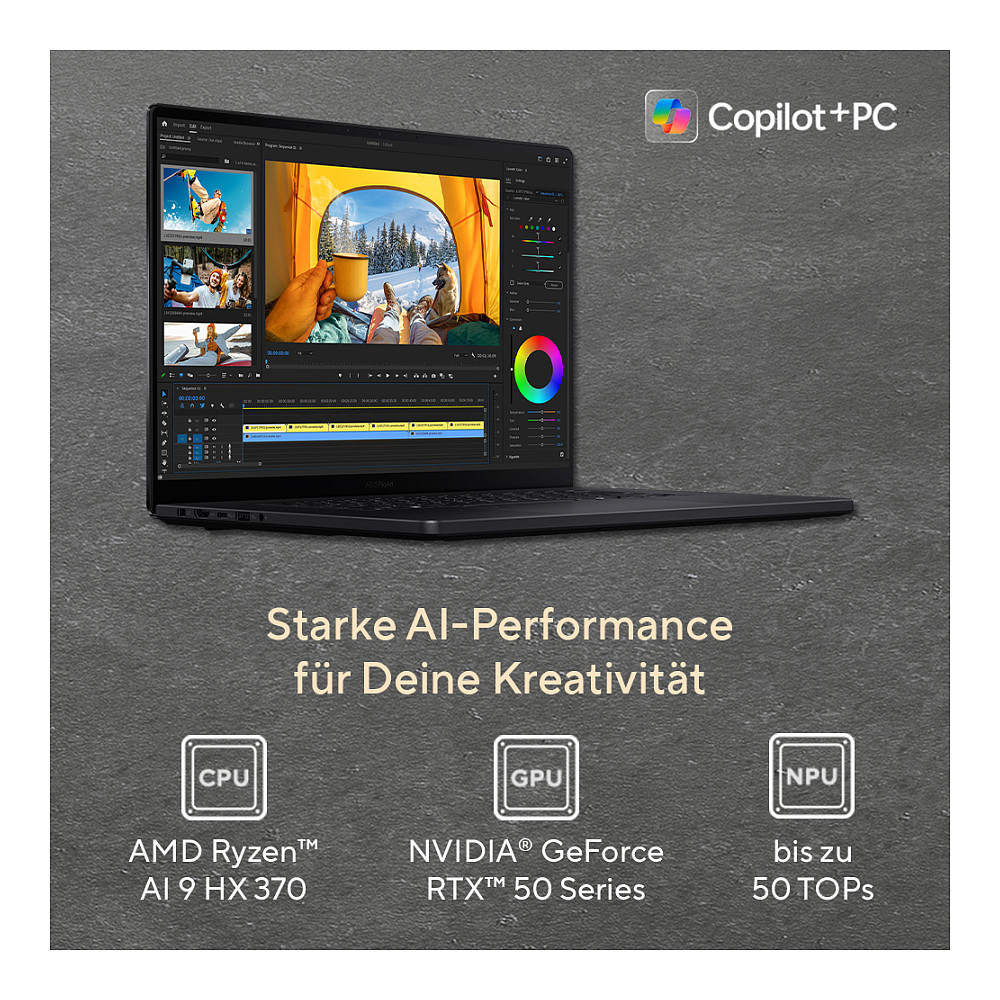 Erlebe eine nie dagewesene Leistung in Deinen kreativen Projekten dank des NVIDIA® Studio-validierten Notebooks, ausgestattet mit einer NVIDIA® GeForce RTX™ 5080 Grafik, einer bis zu 50 TOPs NPU und einem AMD Ryzen™ AI 9 HX 370 Prozessor. Dank der integrierten AMD Ryzen™ AI eröffnet sich eine völlig neue Dimension der Effizienz in puncto Arbeit, Zusammenarbeit und Innovation, damit Du besser mit der Welt um Dich herum in Verbindung bleibst. Als Copilot+ PC mit dedizierter Copilot-Taste sind fortschrittliche AI-Funktionen wie Windows-Studioeffekte, Cocreator und Live-Untertitel nur einen Klick entfernt. Alles funktioniert sofort, mit und ohne Internetverbindung, spart Energie und schützt Deine Privatsphäre.