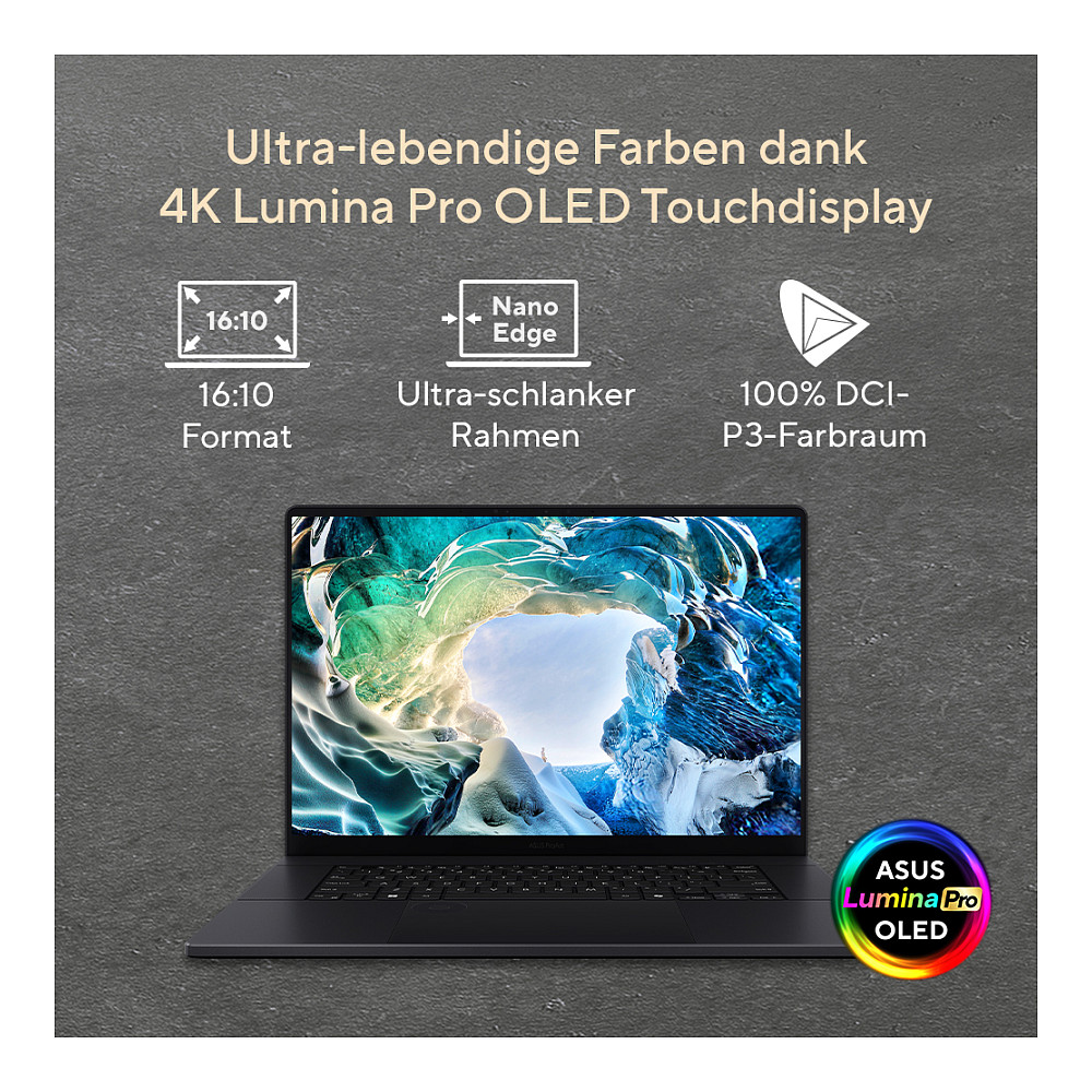 Das atemberaubende, farbgenaue 16 Zoll 4K Lumina Pro OLED Touchdisplay sorgt für beeindruckend lebensechte Visuals. ASUS Lumina Pro OLED Displays sind die nächste Generation innovativer Bildschirme. Das ultrascharfe OLED-Panel liefert atemberaubende Bilder mit außergewöhnlicher Farbgenauigkeit, klareren Details, flüssigerer Bewegungswiedergabe und integrierter Augenpflege. Eine Bildwiederholfrequenz von 120Hz und die VRR-Technologie (Variable Refresh Rate) sorgen für extrem flüssige Bewegungen und gestochen scharfe Bildübergänge. Ideal für Videobearbeitung, Animation und Spieledesign, wo jedes Bild zählt. Das Display ist werkseitig kalibriert, um eine Farbgenauigkeit von Delta E < 1 zu erreichen. Diese Präzision gewährleistet, dass die Bildschirmdarstellung der ursprünglichen kreativen Arbeit treu bleiben. Dank der VESA DisplayHDR True Black 1000 Zertifizierung bietet das Display tiefere Schwarztöne. Und mit den 6 umgebenden Lautsprechern und 3 Mikrofonen tauchst Du vollkommen in eine Welt audiovisueller Brillanz ein.