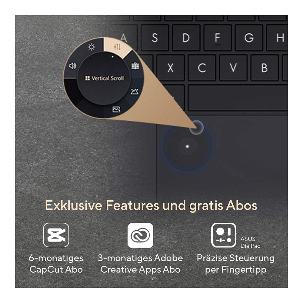 Die ASUS exklusiven, AI-gesteuerten Anwendungen wie MuseTree und StoryCube helfen Dir, Ideen zu entwickeln, kreative Inhalte intelligent zu verwalten und Deine Visionen schnell umzusetzen. Ergänzt wird das Ganze durch das ASUS DialPad – einen anpassbaren physischen Controller, mit dem Du kreative Apps wie Adobe Photoshop oder Premiere Pro präzise und intuitiv per Fingertipp steuern kannst. Für noch mehr kreative Freiheit bekommst Du beim Kauf des ProArt P16 ein 6-monatiges CapCut- sowie ein 3-monatiges Adobe Creative Cloud-Abo gratis dazu. So verbindest Du intuitive Bedienung mit professionellen Tools für schnelle und hochwertige Ergebnisse.