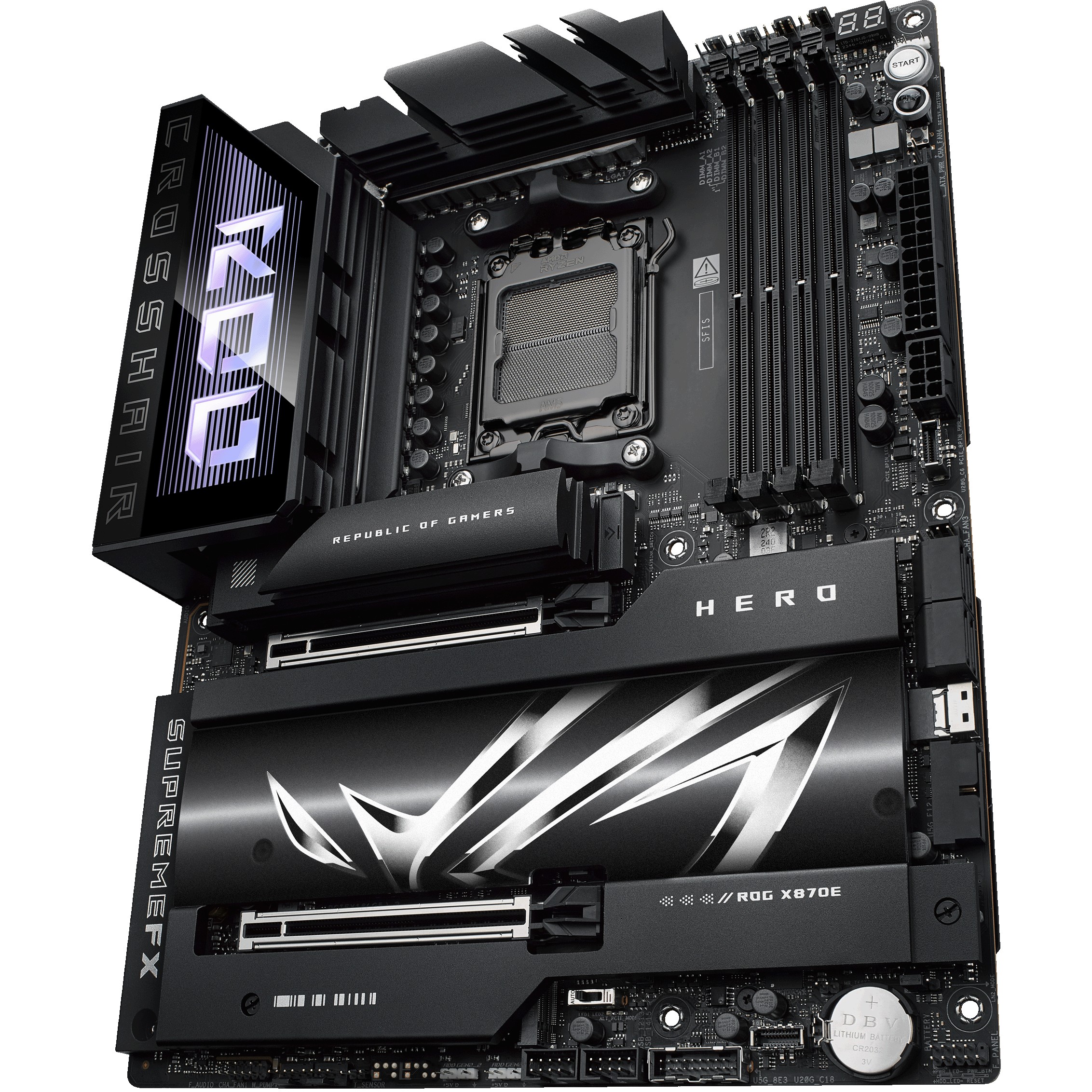 Das KI-PC-fähige ROG Crosshair X870E Hero bietet eine unnachgiebige Stromversorgung, ein robustes Kühlsystem, Hyperspeed-Konnektivität, umfassende PCIE 5.0- und DDR5-Unterstützung, um die Leistung von AMD Ryzen™ Prozessoren der 9000er Serie zu entfesseln. Dunkle Farbtöne überwiegen auf diesem Mainboard und lenken deine Aufmerksamkeit auf hochwertige Metalltexturen, vernickelte Oberflächen, schlanke Konturen und einen stereoskopischen visuellen Effekt auf dem großen M.2- und Chipsatz-Kühlkörper. Dieses Board verfügt außerdem über unseren Polymo Lighting II Effekt. Dieses verbesserte Beleuchtungsmodul, das in die I/O-Abdeckung integriert ist, bietet eine dynamischere RGB-Beleuchtung für das charakteristische ROG-Logo.