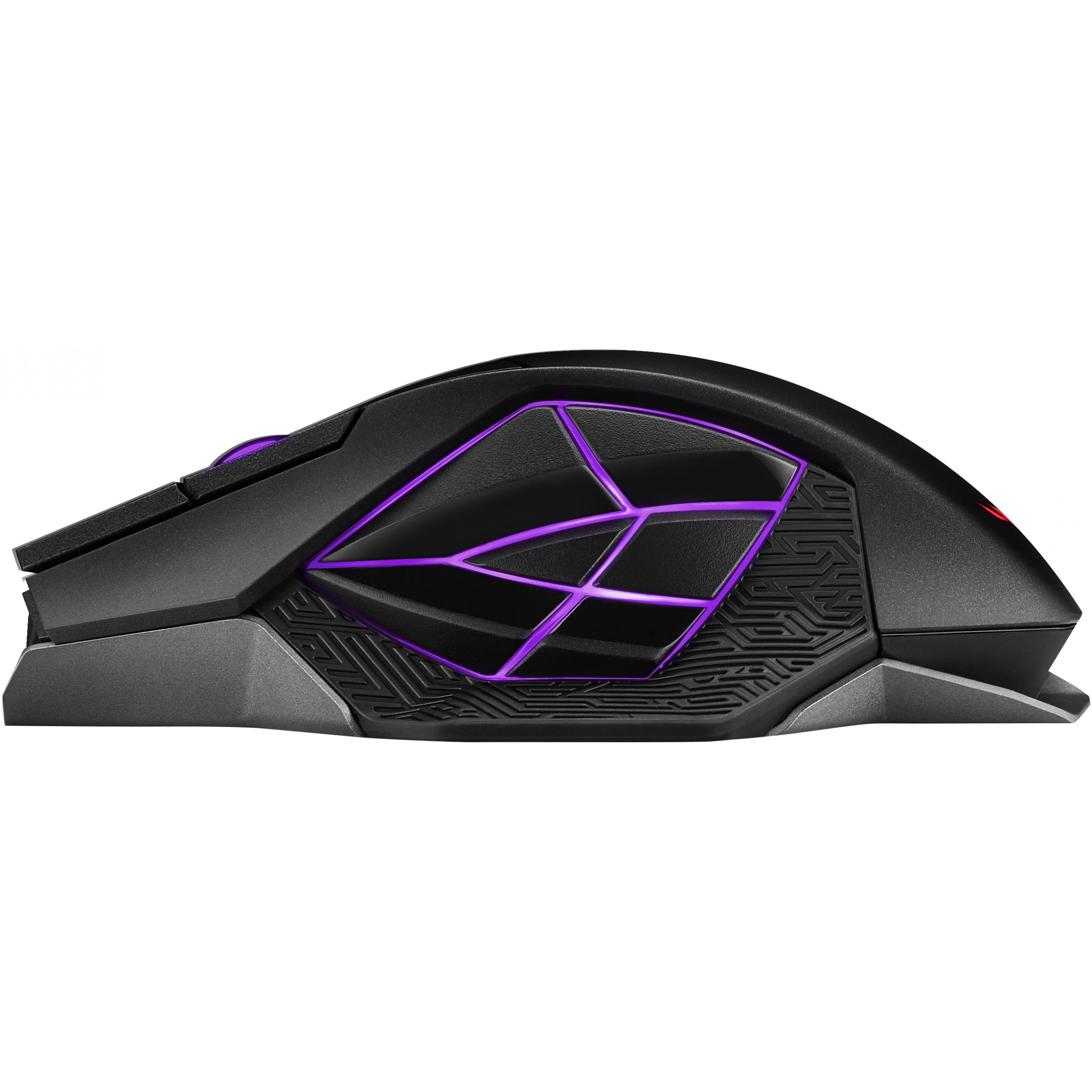 Kabellose Gaming-Maus mit Dual-Mode-Konnektivität (kabelgebunden / 2,4GHz) mit magnetischer Ladestation, 12 programmierbaren Tasten, speziell kalibriertem ROG-Sensor mit 19.000 dpi, exklusivem Push-Fit-Schaltersockeldesign, ROG-Mikroschaltern, ROG-Paracord und Aura-Sync-RGB-Beleuchtung