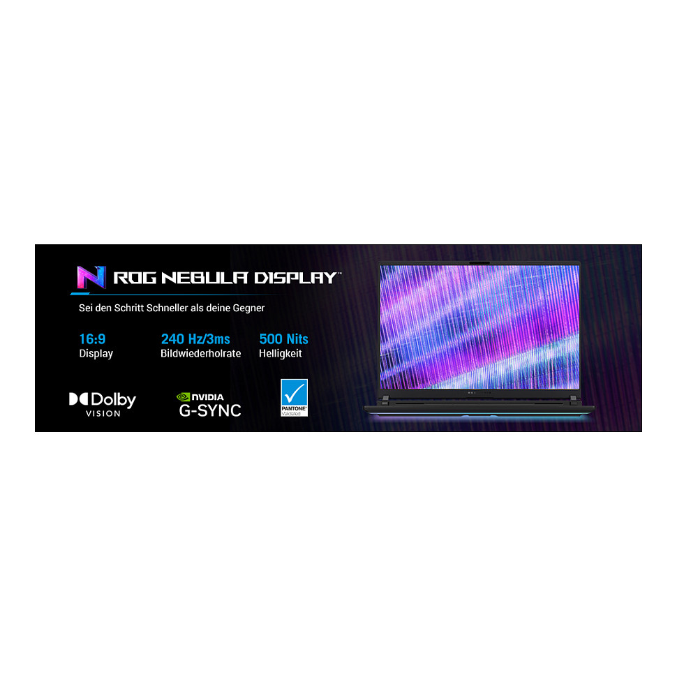 Das beeindruckende 16 Zoll 2,5K ROG Nebula HDR Display im 16:10-Format bietet eine ultraschnelle Bildwiederholrate von bis zu 240Hz und eine blitzschnelle Reaktionszeit von nur 3ms. Dank einer Helligkeit von bis zu 500 Nits und 100% DCI-P3-Farbraumabdeckung genießt Du leuchtende Farben und gestochen scharfe Details, selbst bei hellem Umgebungslicht. Das Display ist TÜV Rheinland zertifiziert für extrem niedrige Blaulicht Emmissionen, wodurch Deine Augen auch bei langen Gaming-Sessions geschont werden. G-Sync und Dolby Vision sorgen für flüssige Bewegungen und atemberaubende Bildqualität, während die Pantone Validierung für präzise Farbdarstellung steht. Mit einem Screen-to-Body-Ratio von 90% tauchst Du noch tiefer in Deine Spielewelt ein und erlebst ein visuelles Spektakel, das Dich nicht mehr loslässt.