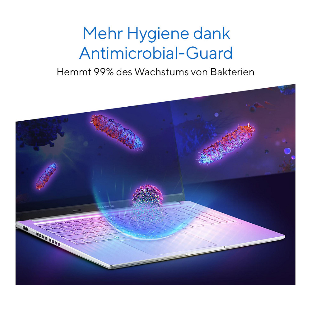 Bei der Entwicklung des Vivobook 15 OLED stand auch die Sicherheit der Nutzerinnen und Nutzer im Vordergrund. Zum einen wird Deine Privatsphäre durch eine Schiebeabdeckung über der Full-HD Webcam geschützt. Darüber hinaus bietet Dir der Fingerabdrucksensor auf dem Touchpad des Vivobook 15 OLED die Möglichkeit, das Gerät mit nur einer Berührung einzuschalten, ohne dass jemand anderes Zugriff darauf hat. Zusätzlich schützt dich der Antimicrobial-Guard vor Bakterien. Tests mit Kolibakterien ergaben einen Sicherheitsfaktor von 99 Prozent und einen Schutz von bis zu drei Jahren. So bist Du auch im Alltag außerhalb der eigenen vier Wände sicher und geschützt.