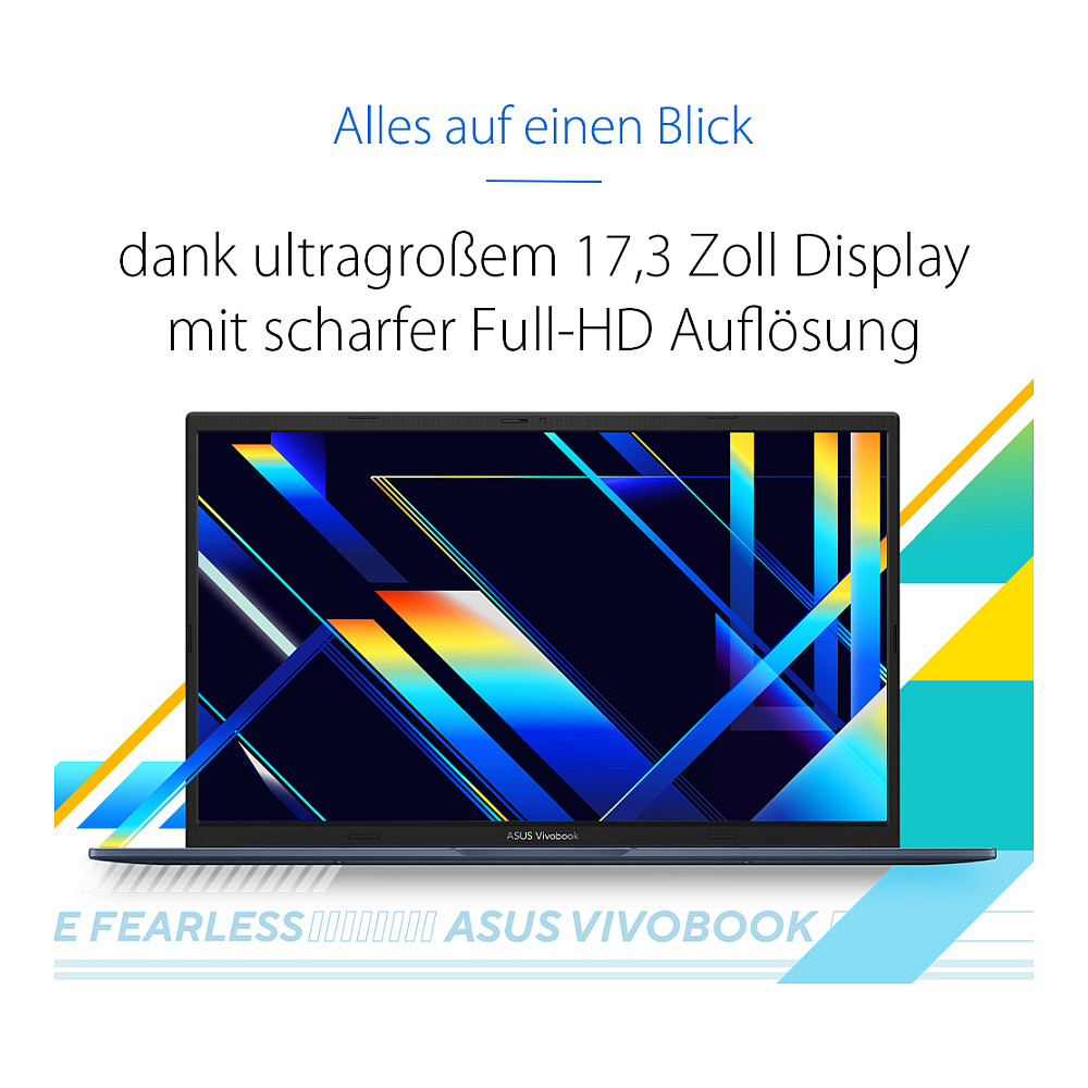 Das 17 Zoll große Display ist das Markenzeichen des ASUS Vivobook 17. Unterstützt wird es von der starken Leistung der neuesten Intel Generation. Ein bis zu Intel® Core™ i7 Prozessor und eine integrierte Prozessorgrafik mit bis zu Intel® Iris® Xᵉ meistern deine Aufgaben. Dazu kommen bis zu DDR 4 Arbeitsspeicher für müheloses Multitasking und ein extra großer SSD-Speicher für schnellen Datentransfer. Damit ist das Vivobook 17 das passende Notebook für alle Bereiche deines Lebens.