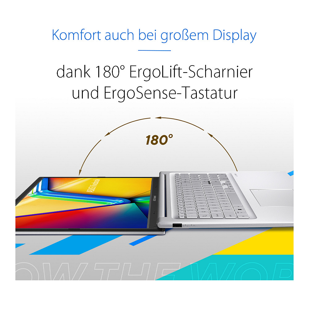 Trotz des großzügigen Bildschirms ist das Vivobook 17 mit lediglich 19,9mm schlank genug, um es leicht zu transportieren. Auch bei längeren Sessions wird der Komfort nicht beeinträchtigt. Die ErgoSense-Tastatur mit leicht gewölbten Tasten bietet ein angenehmes Schreibgefühl und verhindert Fingerkrämpfe. Ein weiteres Plus ist das elegante Design der Tastatur mit Num-Keys und Hintergrundbeleuchtung. Darüber hinaus trägt das 180°Scharnier zum Komfort bei, da es ermöglicht, das Vivobook 17 einfach ganz aufzuklappen, um nicht nur die Arbeitsposition zu ändern, sondern auch den Bildschirm schnell und einfach mit anderen Personen zu teilen.
