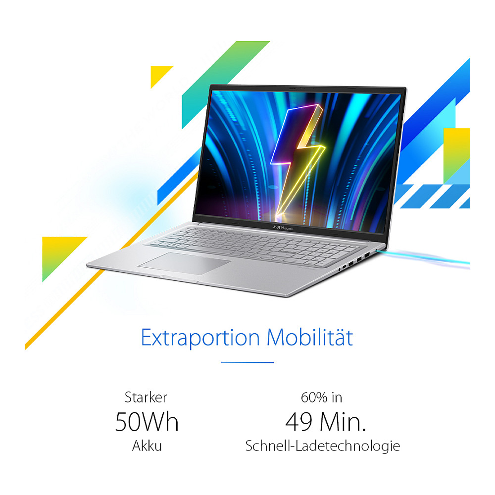 Das Vivobook 17 bietet in vielerlei Hinsicht ein komfortables, leistungsstarkes und sicheres Gesamtpaket. Ein 50Wh Akku liefert die nötige Laufzeit, um auch an langen Arbeitstagen durchzuhalten. Vernetzt bleibst du dank bis zu WiFi 6E und Bluetooth 5. Hinzu kommen vier USB-Anschlüsse, 3 x Typ A und ein Typ C. Der Anschluss externer Geräte ist kein Problem, da ein weiterer HDMI-Anschluss für einen zweiten Bildschirm genutzt werden kann. Das Vivobook 17 ist mit all seinen Features, der Hardware und dem großen Display ein vielseitiges Notebook für den täglichen Gebrauch.