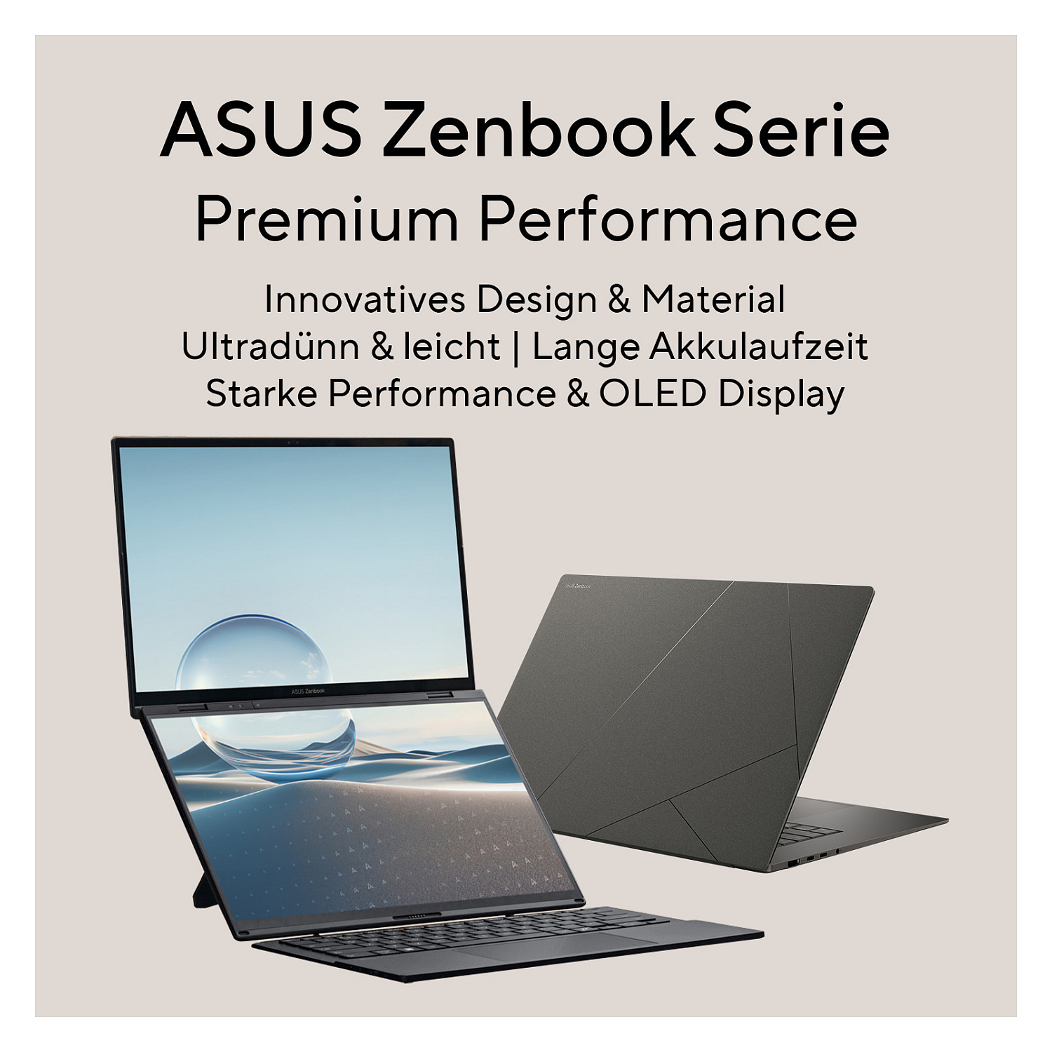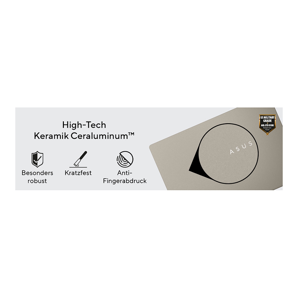 Beim Zenbook A14 kommt Ceraluminum™ – ein Material, das Leichtigkeit und Widerstandsfähigkeit auf einzigartige Weise vereint - zum Einsatz und macht dieses besonders robust gegenüber Kratzern und Stößen, die im mobilen Alltag schnell entstehen. Trotz seiner Widerstandsfähigkeit bleibt der Laptop dabei unglaublich leicht und elegant. Dadurch ist das Zenbook A14 auch unterwegs bestens geschützt, ohne auf ein schlankes und stilvolles Design verzichten zu müssen. Einfach sorgenfrei in den Rucksack packen – Ceraluminum™ schützt es zuverlässig vor den kleinen und großen Herausforderungen des Alltags. Die perfekte Verbindung von Ästhetik und Widerstandsfähigkeit für alle, die keine Kompromisse eingehen wollen.