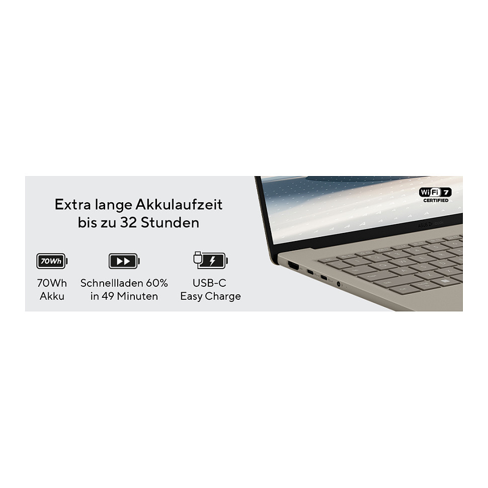Das Zenbook A14 setzt neue Maßstäbe in Sachen Mobilität und Konnektivität. Es kombiniert eine beeindruckende Akkulaufzeit mit der neuesten bis zu WiFi 7 Technologie und revolutioniert damit das Nutzungserlebnis unterwegs. Sein leistungsstarker 70Wh Akku sorgt dafür, dass Du bis zu 32 Stunden lang ohne Verzögerungen arbeiten, streamen und spielen kannst – egal, wo Du dich aufhältst. Die Kombination aus ausdauernder Batterie, stromsparenden Prozessoren und modernster Netzwerktechnologie macht das Zenbook A14 ideal für Vielreisende und mobile Profis. Im Büro, Café oder unterwegs – maximale Produktivität und Konnektivität sind garantiert.