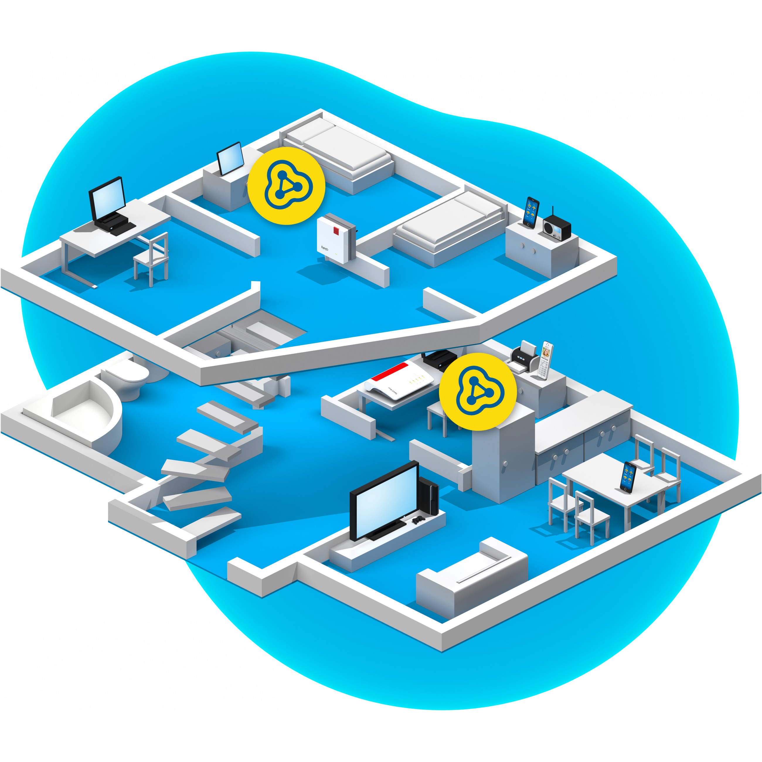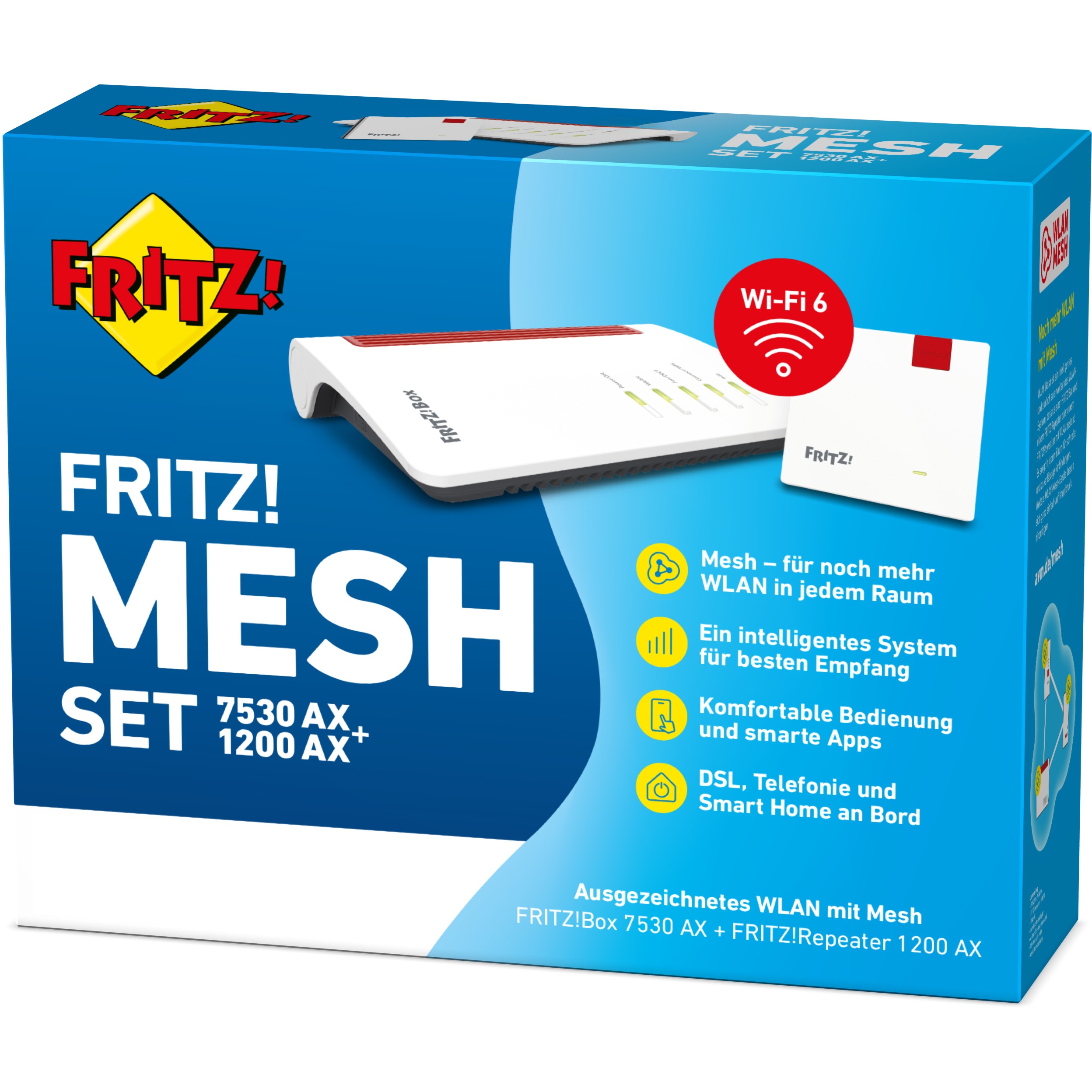 Mesh Set 7530 AX + 1200 AX. Produktfarbe: Rot, Weiß, Antennentyp: Intern, Produkttyp: Mesh-System. WLAN-Band: Dual-Band (2,4 GHz/5 GHz), Top WLAN-Standard: Wi-Fi 6 (802.11ax), WLAN Datentransferrate (max.): 2400 Mbit/s. Mobilfunknetzgenerierung: 3G, 3G-Standards: HSPA, UMTS, 4G-Standards: LTE. Stromverbrauch (Standardbetrieb): 4 W. Breite: 200 mm, Tiefe: 152 mm, Höhe: 45 mm