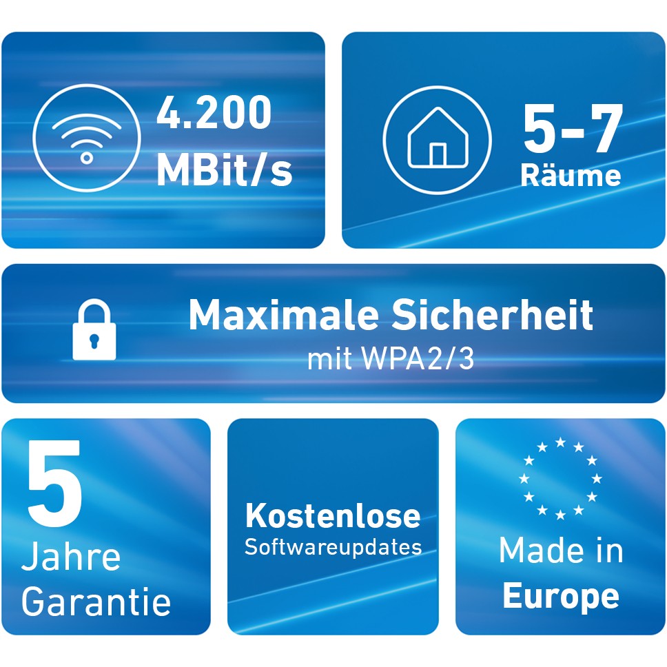 Das energieeffiziente FRITZ!Mesh Set 4200 kommt mit einer fünfjährigen Garantie und erhält regelmäßige, kostenlose Updates, die neue Funktionen hinzufügen und eine kontinuierliche Optimierung gewährleisten. Unser umfassender technischer Support steht Ihnen jederzeit zur Verfügung.