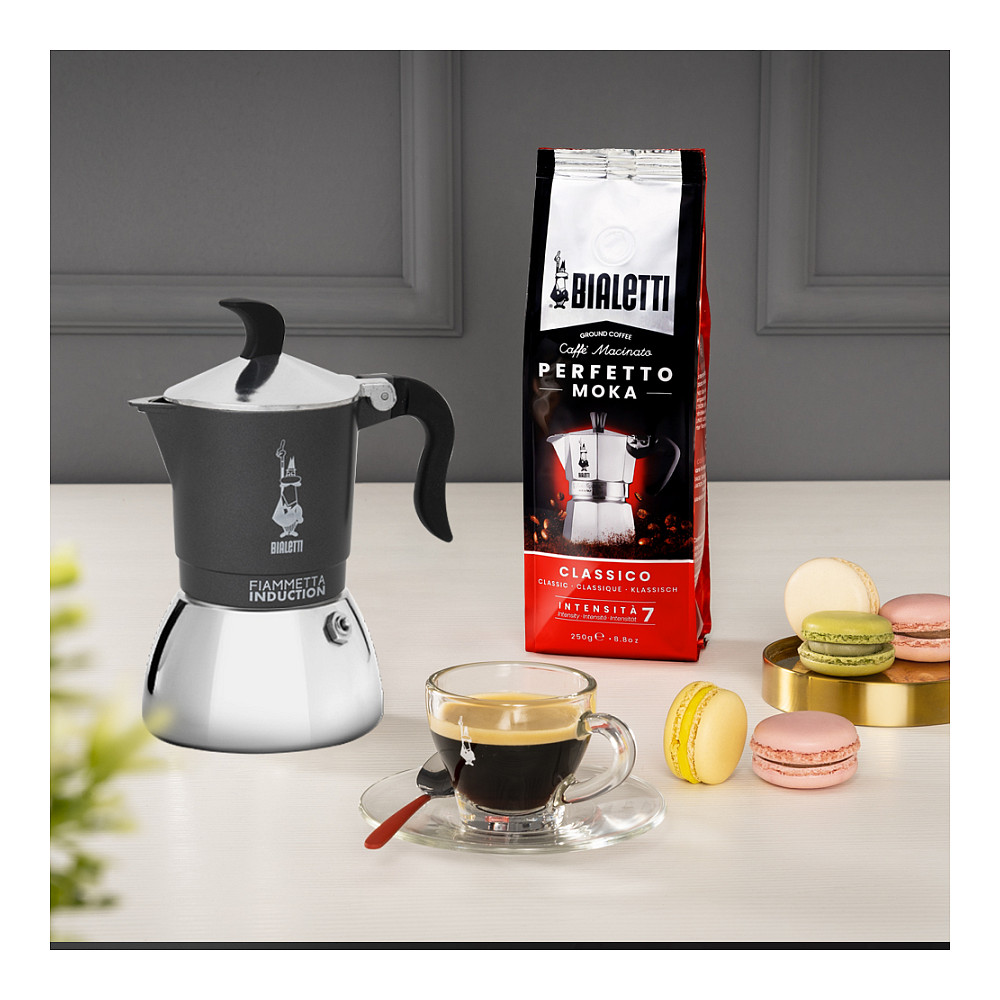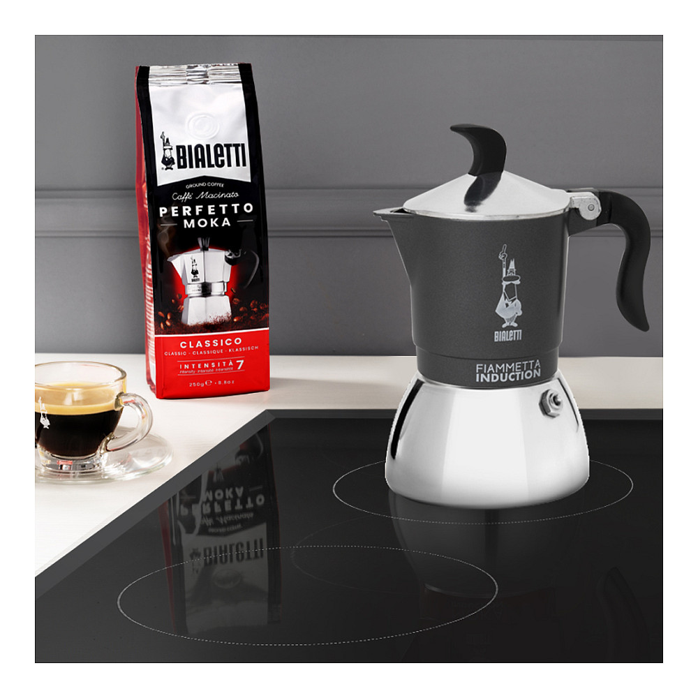 Bialetti Fiammetta Induction. Produkttyp: Mokka-Kanne, Fassungsvermögen: 0,13 l, Produktfarbe: Grau, Silber. Breite: 125 mm, Tiefe (mit Griff): 15 cm, Tiefe: 97 mm. Menge pro Packung: 1 Stück(e)