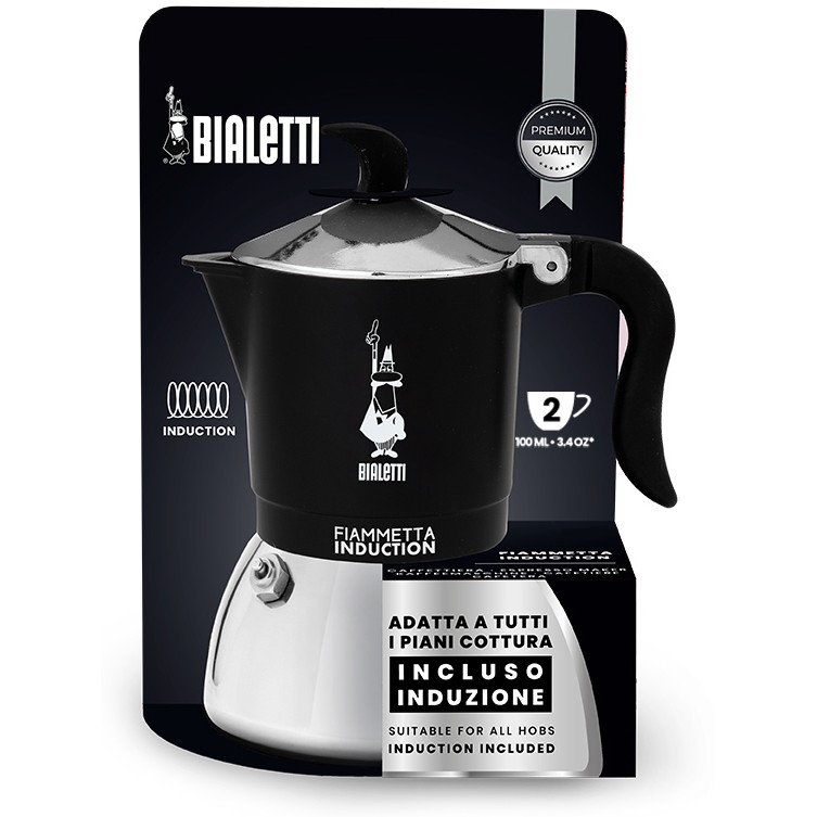 Bialetti Fiammetta Induction. Produkttyp: Mokka-Kanne, Fassungsvermögen: 0,1 l, Produktfarbe: Schwarz, Edelstahl. Breite: 97 mm, Tiefe (mit Griff): 15 cm, Höhe: 125 mm. Menge pro Packung: 1 Stück(e)