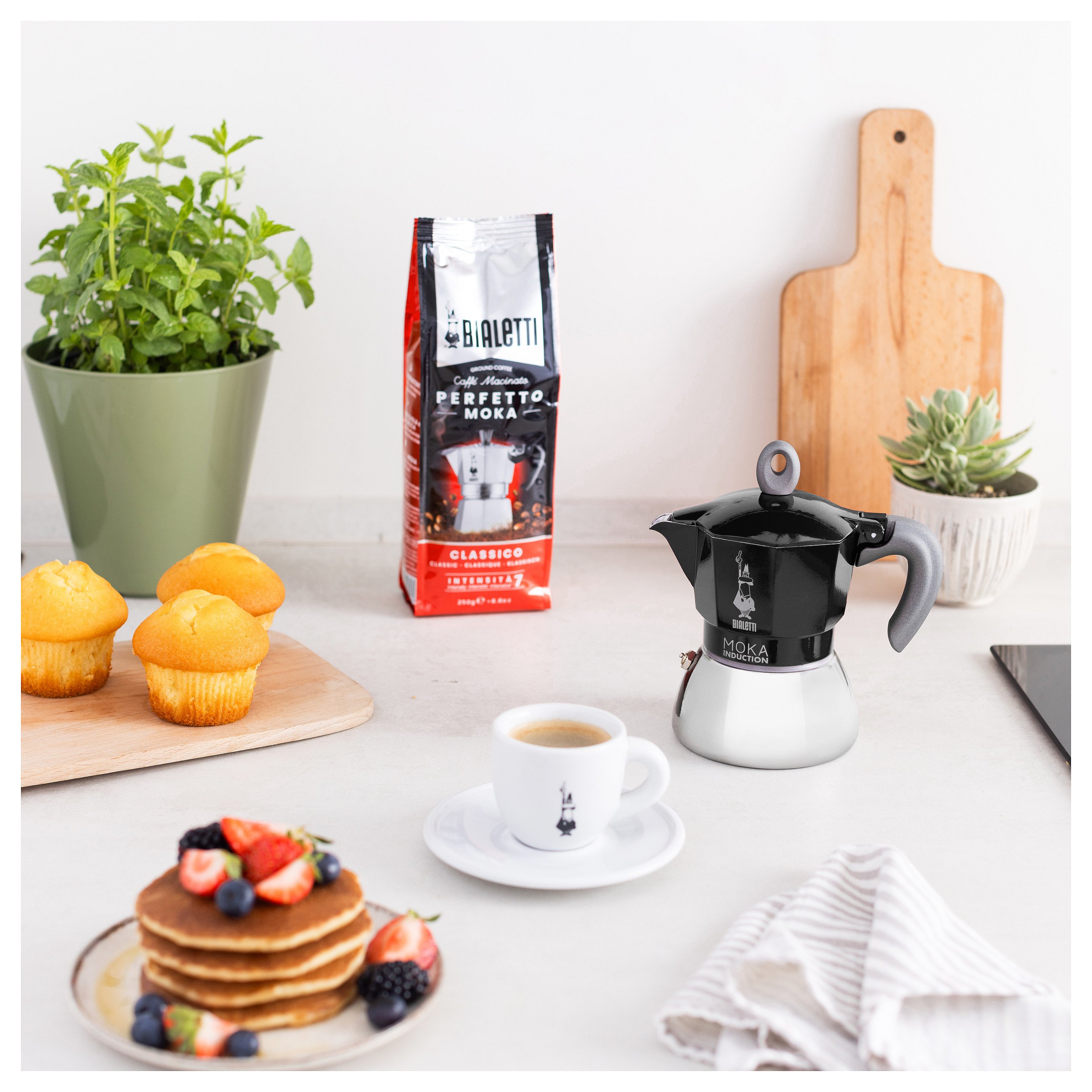 Induktionsmokka-Teekanne Bialetti Moka Induktion für 2 Tassen Kaffee. Der obere Teil besteht aus lebensmittelechtem Aluminium mit roter Oberfläche, der untere Teil aus poliertem Edelstahl 18/10 und einem hitzebeständigen schwarzen Kunststoffgriff.