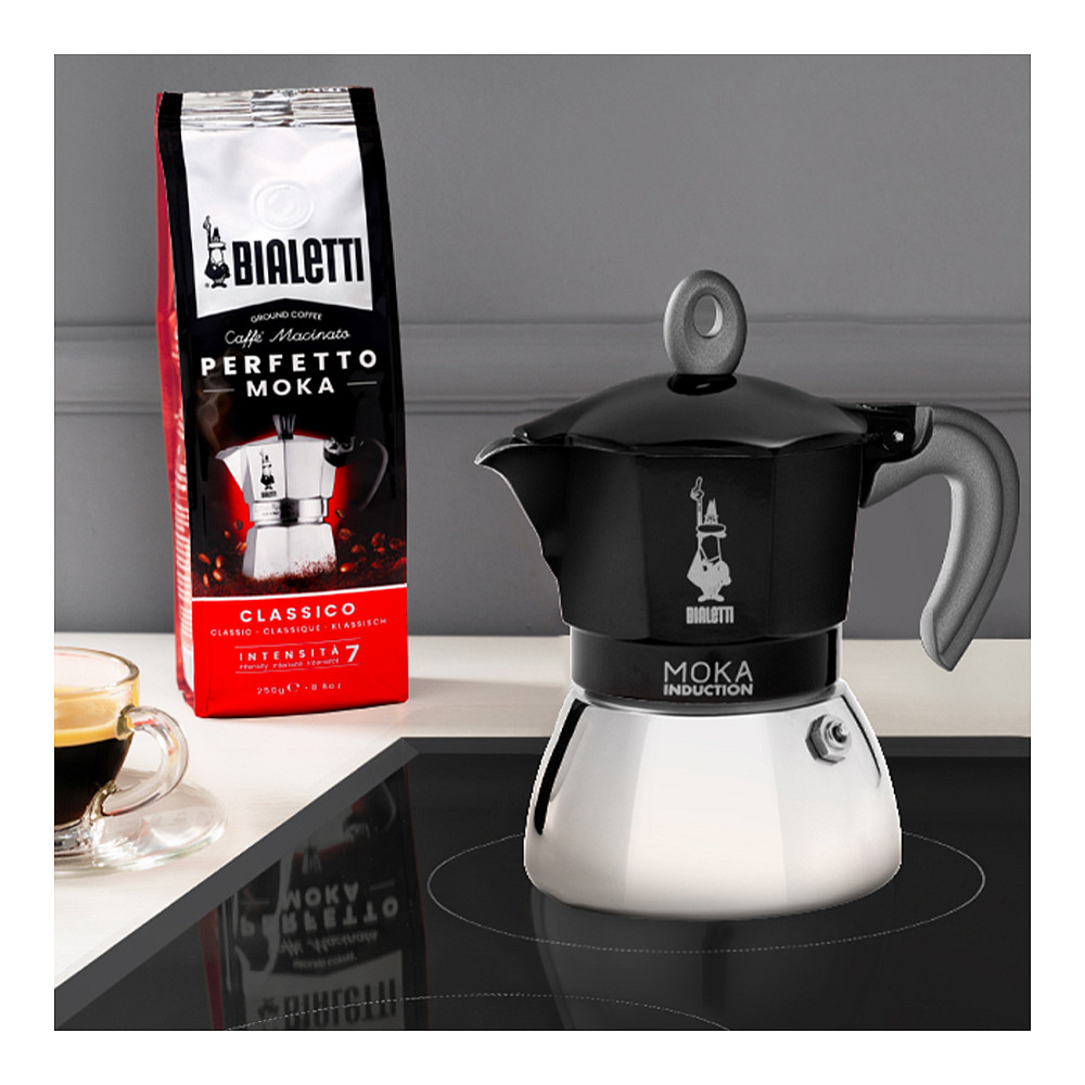 Induktionsmokka-Teekanne Bialetti Moka Induktion für 2 Tassen Kaffee. Der obere Teil besteht aus lebensmittelechtem Aluminium mit roter Oberfläche, der untere Teil aus poliertem Edelstahl 18/10 und einem hitzebeständigen schwarzen Kunststoffgriff.