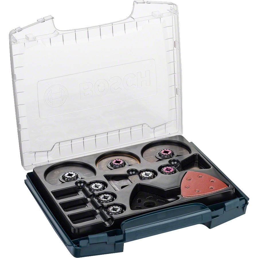 Setinhalt: BIM Segmentsägeblatt Wood and Metal ACZ 100 BB (1x) / BIM-TiN Segmentsägeblatt Multi Material ACI 85 EB (1x) / BIM Segmentwellenschliffmesser ACZ 100 SWB (1x) / BIM Tauchsägeblatt Wood and Nails AIZ 65 BB (2x) / BIM Tauchsägeblatt Wood and Metal AIZ 28 EB (2x) / BIM Tauchsägeblatt Hard Wood AIZ 32 BB (2x) / HCS Tauchsägeblatt Wood AIZ 32 EC (2x) / HCS-Schaber ATZ 52 SFC (2x) / Schleifplatte AVI 93 G (1x) / Wood Schleifblatt (20x) / Universaladapter (2x)