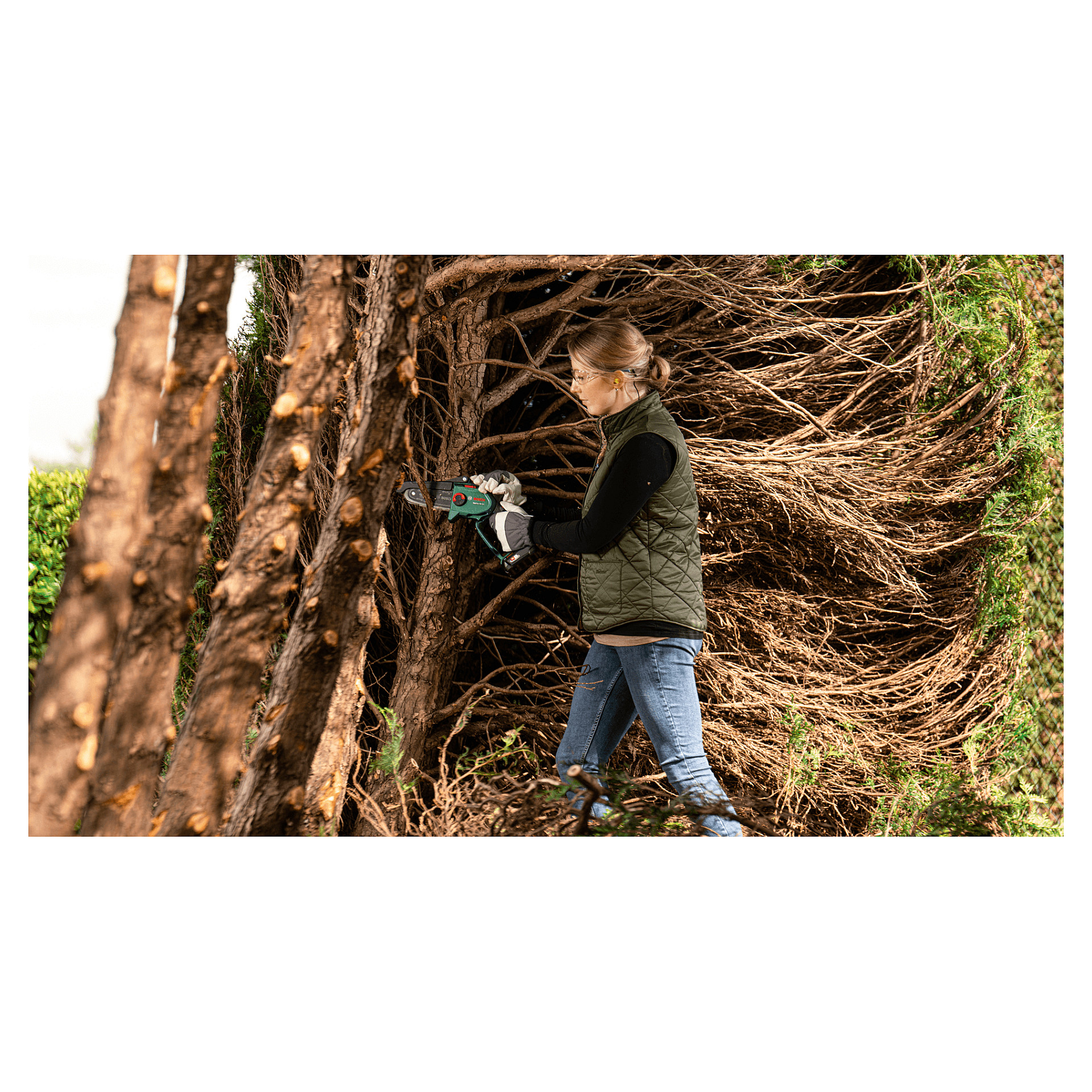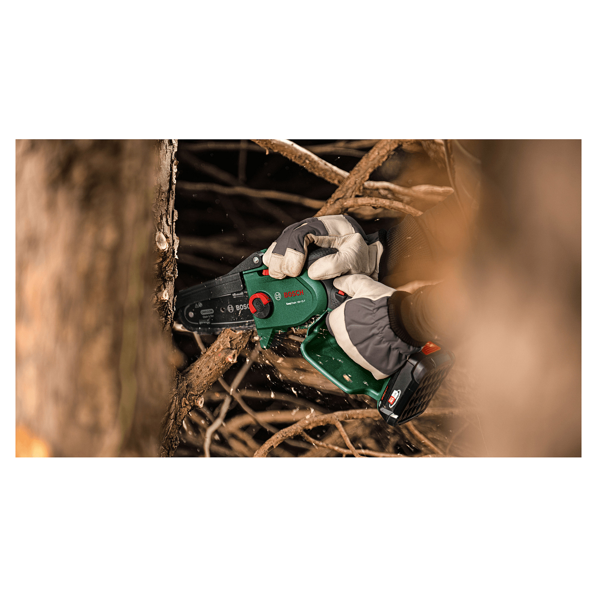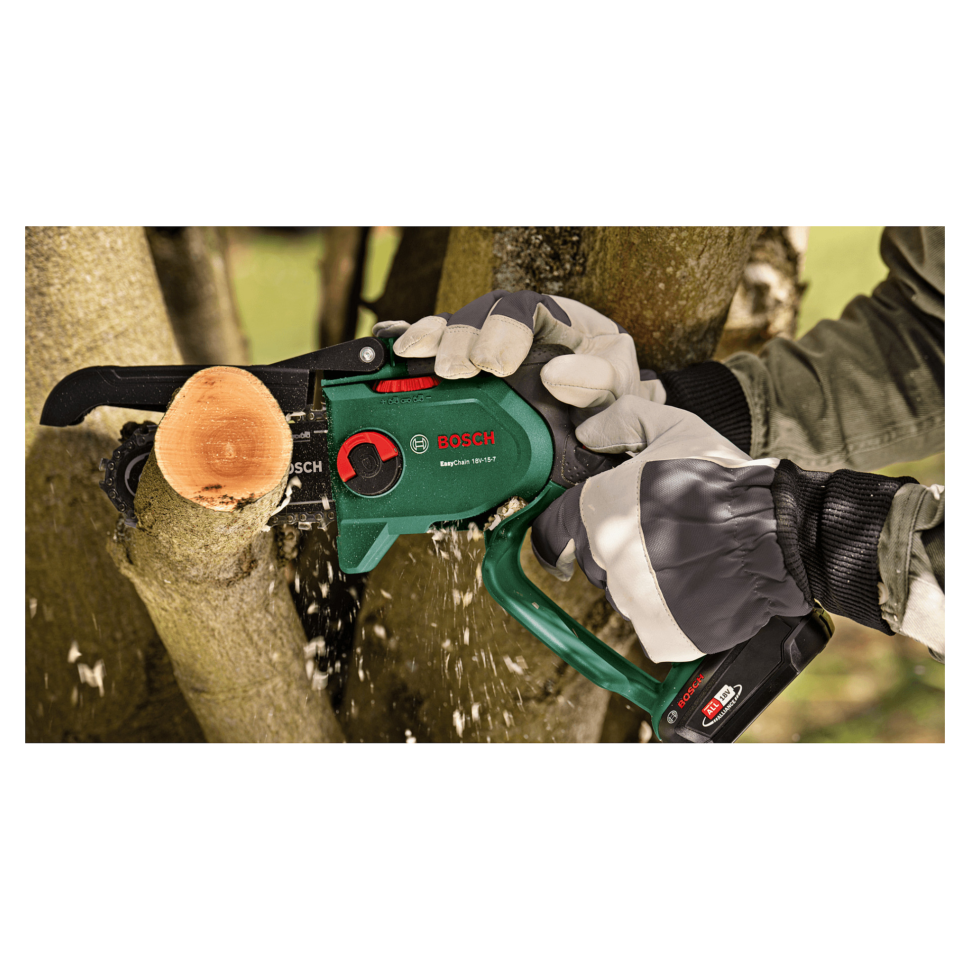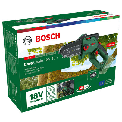 Bosch EasyChain 18V-15-7. Schnittlänge: 13 cm, Kettenlasche Länge: 15 cm, Kettengeschwindigkeit: 6,95 m/s. Energiequelle: Akku, Batteriekapazität: 2,5 Ah, Akku-/Batteriespannung: 18 V. Breite: 102 mm, Höhe: 237 mm, Länge (mm): 370 mm