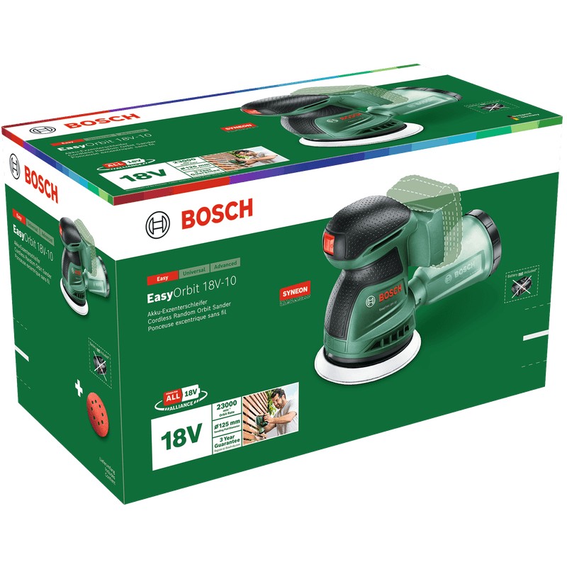 Bosch EasyOrbit 18V-10. Schleifmachine Sorte: Schwingschleifer, Produktfarbe: Schwarz, Grün. Leerlauf-Oszillationsrate (max.): 23000 OPM, Schwingkreisdurchmesser: 1 mm. Energiequelle: Akku, Batteriekapazität: 2,5 Ah, Akku-/Batteriespannung: 18 V. Breite: 122 mm, Tiefe: 144 mm, Höhe: 154 mm