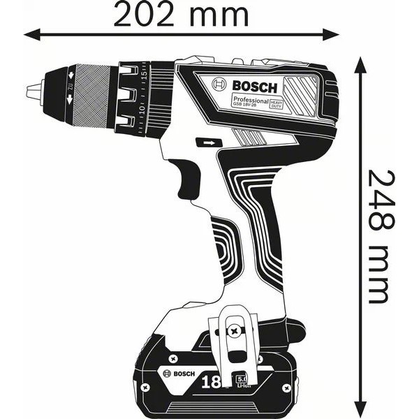 Der GSB 18V-28 Professional verfügt außerdem über 2 Gänge, Autolock, Electronic Cell Protection und einen Lithium-Ionen-Akku.