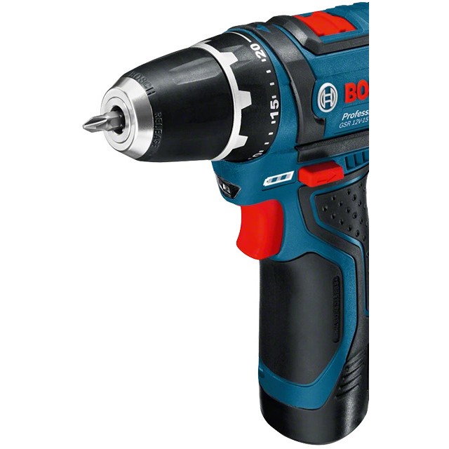 Der GSR 12V-15 Professional verfügt außerdem über 2 Gänge, Autolock, Ladezustandsanzeige, Electronic Motor Protection und Lithium-Ionen-Technologie.