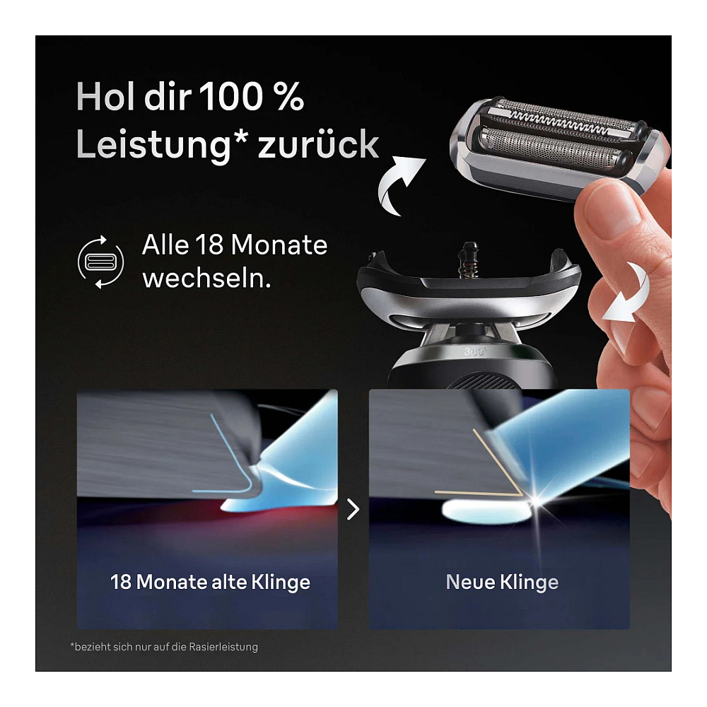 Der durchschnittliche Braun Rasierer schneidet alle 18 Monate 6 Millionen Haare. Dies bedeutet, dass der Scherkopf allmählich verschleißt und die Rasur weniger gründlich und angenehm werden kann. Deshalb empfiehlt Braun, den Scherkopf deines Rasierers alle 18 Monate zu wechseln, um den Rasierer wieder in Bestform zu bringen. Pflege deinen Rasierer, und er belohnt dich im Gegenzug mit optimaler Bartpflege.