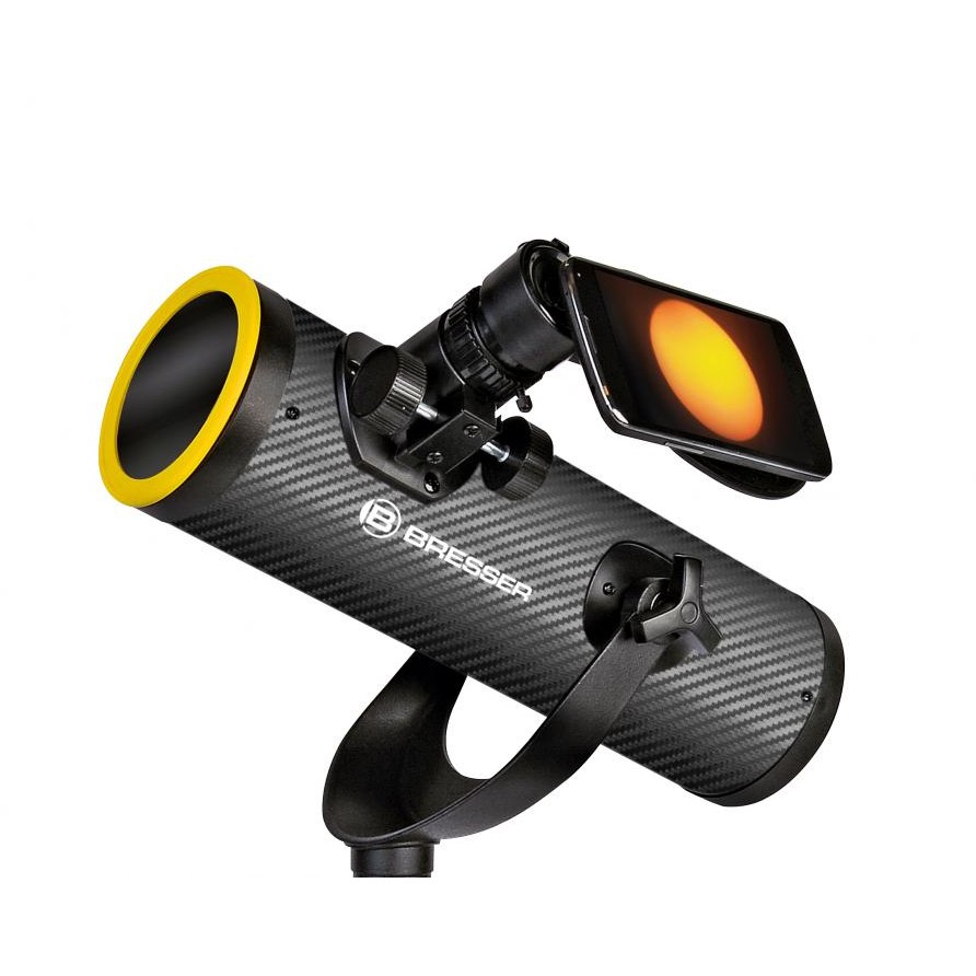 Lassen Sie sich faszinieren vom einmaligen Erlebnis Sonnenbeobachtung aber auch des nächtlichen Sternenhimmels!Mit dem BRESSER Solarix 76/350 präsentieren wir Ihnen das erste Newton-Teleskop, mit dem Sie auch die Sonne beobachten können. Und das mit einer zertifizierten Qualität und zu einem sensationellen Preis!Noch nie war es für die breite Bevölkerung so einfach, kostengünstig und vor allem sicher, mit einem Teleskop sowohl den Nachthimmel als auch die Sonne zu beobachten. Möglich macht es der speziell für dieses Teleskop entwickelte Sonnenfilter. Die darin verbaute Spezialfolie schützt das Auge bei Sonnenbeobachtungen zuverlässig vor Infrarot-, ultraviolettem und sichtbarem Licht. Hindurchgelassen wird nur das für die Augen unschädliche, gedämpfte Licht der Sonne und erscheint als wunderbares Bild im Okular.Und das Beste: Mit der im Lieferumfang ebenfalls enthaltenen Smartphone-Halterung können Sie mit Ihrem Handy ganz einfach Fotos von Beobachtungsobjekten machen - vergrößert und in Farbe* wie mit einem Tele-Objektiv!Selbstverständlich besitzt das BRESSER Solarix 76/350 auch alle optischen Voraussetzungen für astronomische Beobachtungen am Nachthimmel. Das enthaltene Zubehör bietet dabei alles für den sofortigen Beobachtungsstart. Schnell ist der Newton-Reflektor aufgebaut und mit der umfangreichen Bedienungsanleitung eingerichtet.Bitte beachten Sie, dass Spiegelteleskope der Bauart Newton sehr gut für astronomische Beobachtungen am Sternenhimmel sind, jedoch nicht gut geeignet für Natur- und Landschaftsbeobachtungen am Tage. Für Natur- und Landschaftsbeobachtungen empfehlen wir deshalb BRESSER Linsenteleskope.