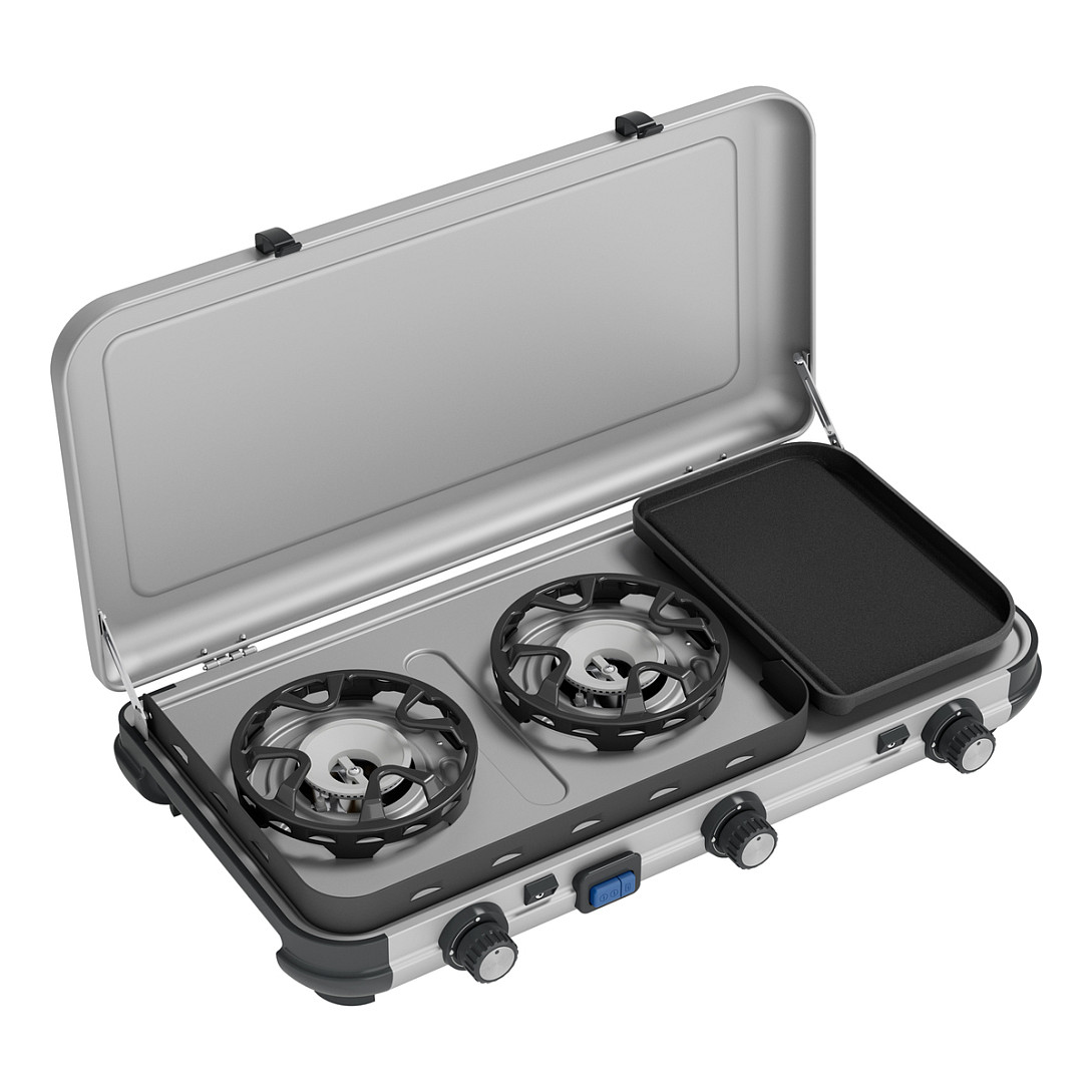 Der Camping Kitchen 2 Multi Cook Campingkocher ist ein All–in-One Modell und bietet sowohl Campingkocher als auch Campinggrill in einem Modell.