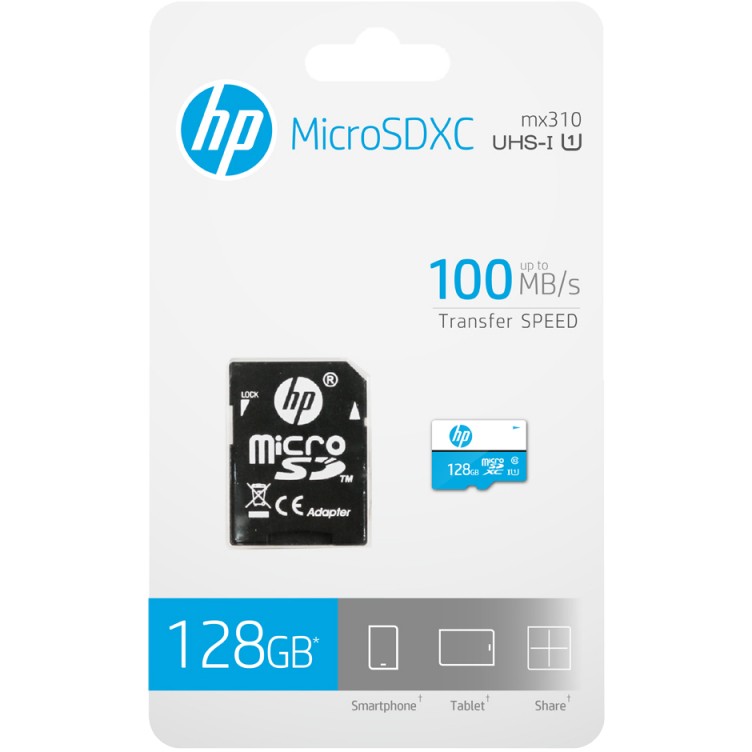 HP HFUD128-1U1BA. Kapazität: 128 GB, Flash Card Typ: MicroSDXC, Flash-Memory-Klasse: Klasse 10, Interner Speichertyp: UHS-I, Lesegeschwindigkeit: 100 MB/s, UHS Speed Klasse: Class 1 (U1). Produktfarbe: Blau, Weiß
