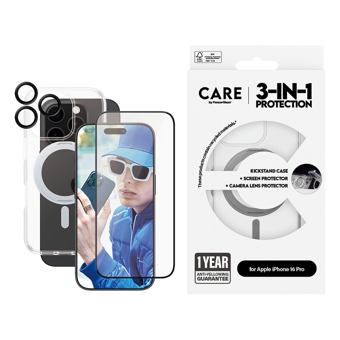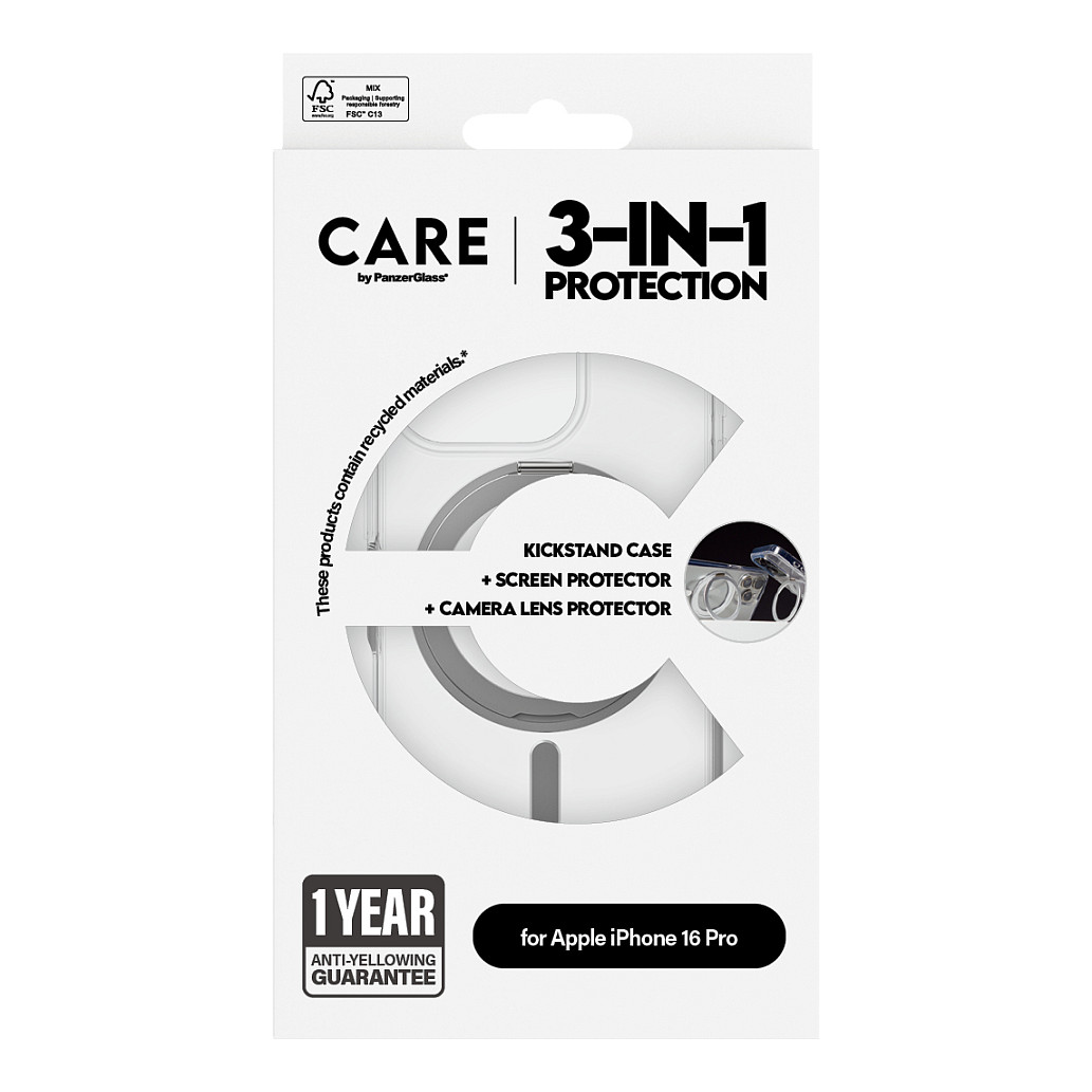 Verbessere den Schutz deines Handys mit dem CARE by PanzerGlass® 3-in-1 Feature Bundle, das für alle entwickelt wurde, die Premiumqualität für ihr Gerät verlangen. Dieses Bundle enthält einen Ceramic Displayschutz und einen Ceramic Hoops® Kameraschutz von PanzerGlass® sowie eine transparente Hülle mit Kickstand von CARE by PanzerGlass®. Zusammen sorgen sie dafür, dass dein Gerät sicher ist und gleichzeitig ein hochwertiges Aussehen hat, das zu deinem Stil passt.