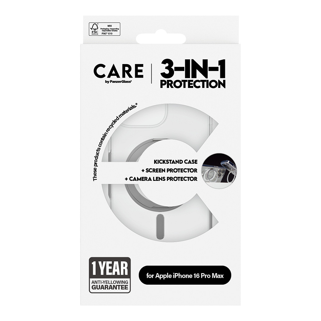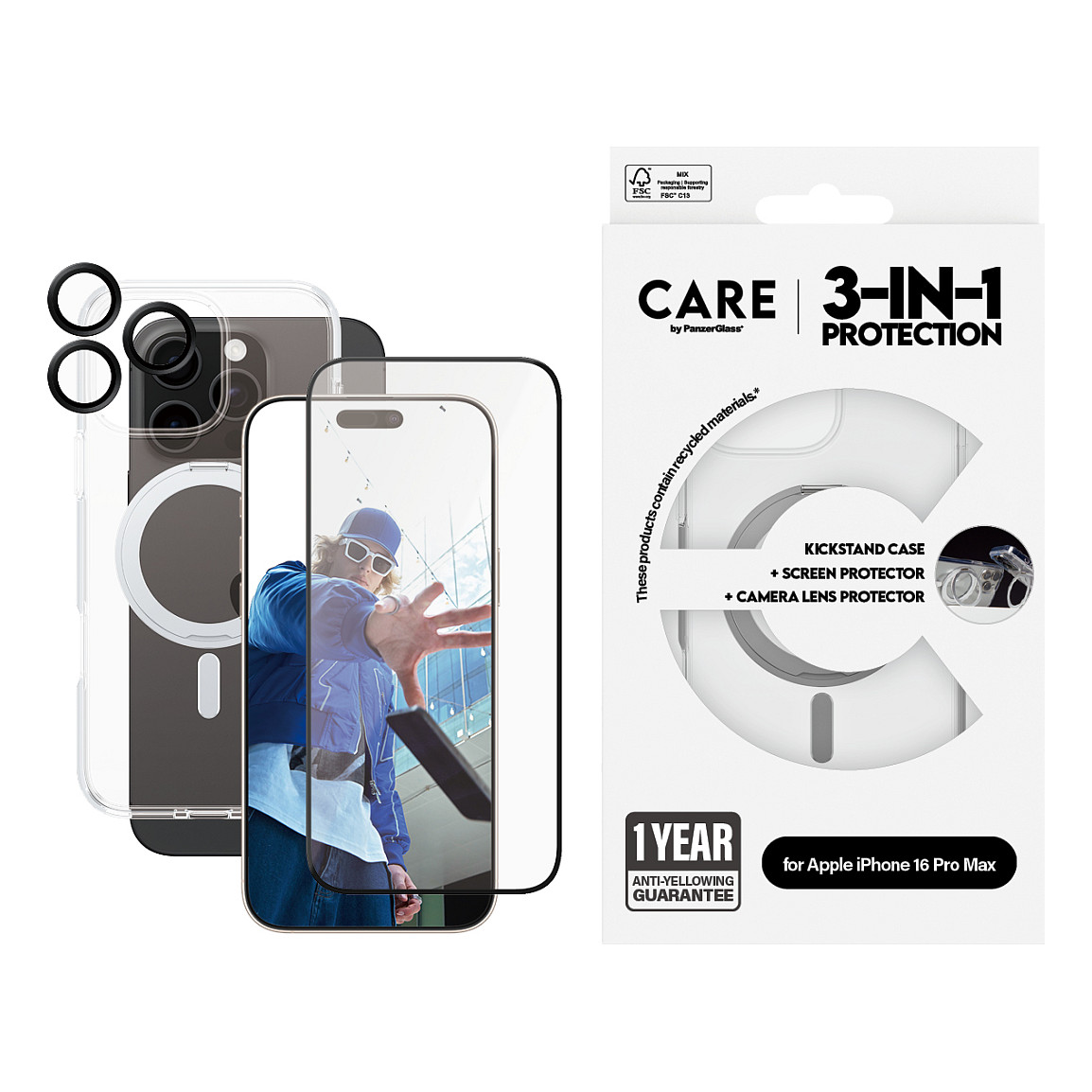 Verbessere den Schutz deines Handys mit dem CARE by PanzerGlass® 3-in-1 Feature Bundle, das für alle entwickelt wurde, die Premiumqualität für ihr Gerät verlangen. Dieses Bundle enthält einen Ceramic Displayschutz und einen Ceramic Hoops® Kameraschutz von PanzerGlass® sowie eine transparente Hülle mit Kickstand von CARE by PanzerGlass®. Zusammen sorgen sie dafür, dass dein Gerät sicher ist und gleichzeitig ein hochwertiges Aussehen hat, das zu deinem Stil passt.